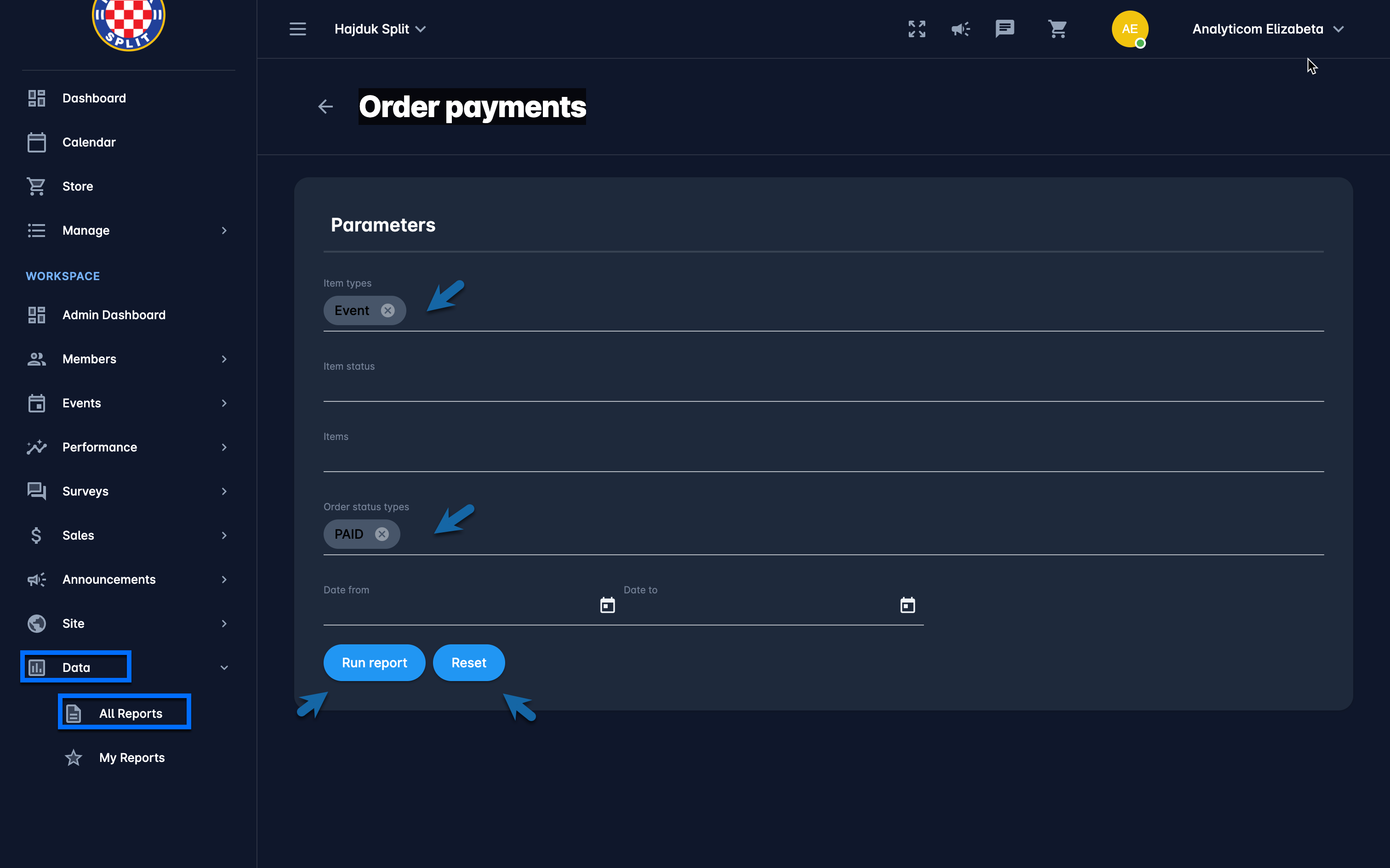 👉 You’ll notice that once you run the report with certain parameters, these parameters are remembered by the system, e.g. if you run the Order payments with parameters set as Type = Event and Order status = PAID, these parameters will be set as default next time you reopen this report or the repoert with the similar parameter (e.g. order items report). If you want to clear the parameters, simply press the Reset button.