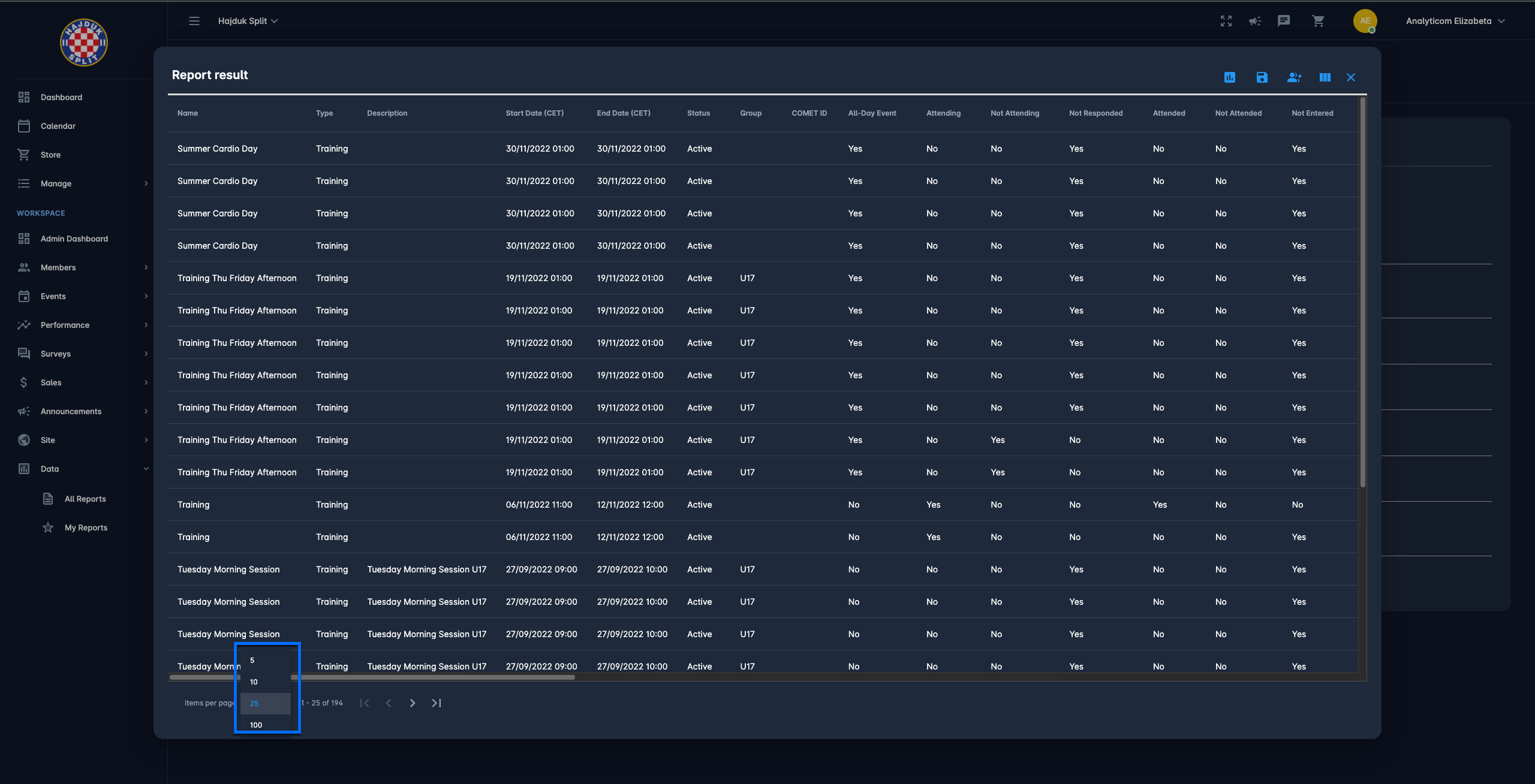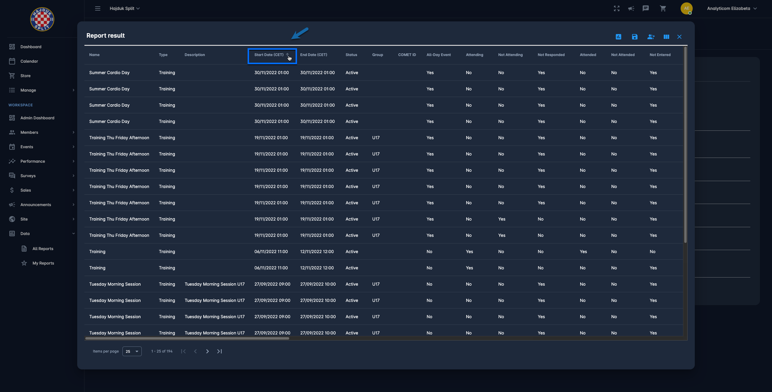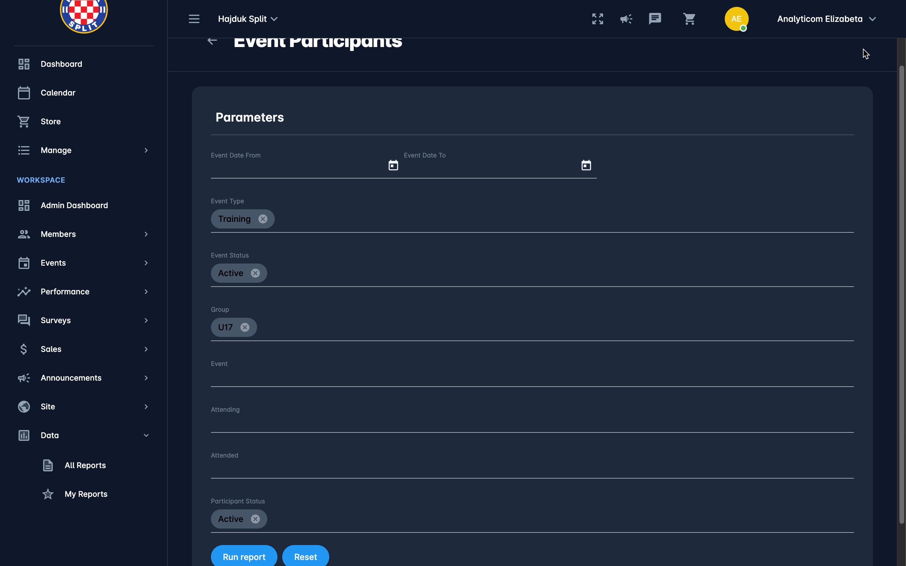 👉 Let's take the example of the user who wants to generate a list of participants of all active training that belong to the specific under the specific group. In this scenario, the user will select the Event Participants to report with the parameters: