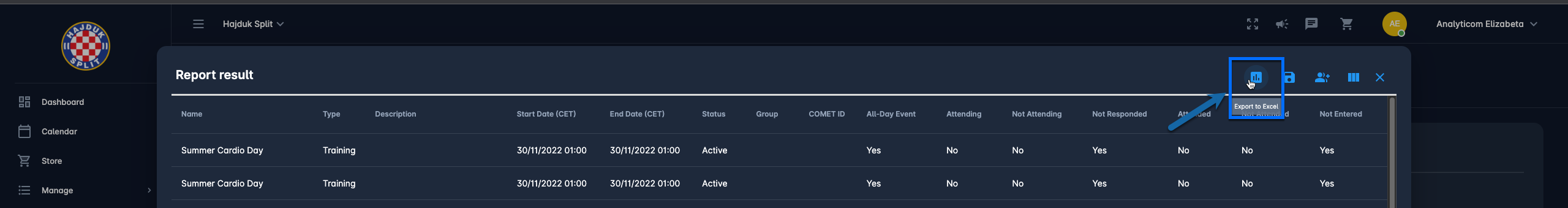 For additional analysis and processing of the presented data results, there is an option to export data to Excel. The export feature will pick up exactly the order and the columns that are visible on the screen, including all pages of results. Simply run the report whose data you want to export, remove the columns that are not necessary and export it by clicking the chart icon in the top, right-hand corner of the report.