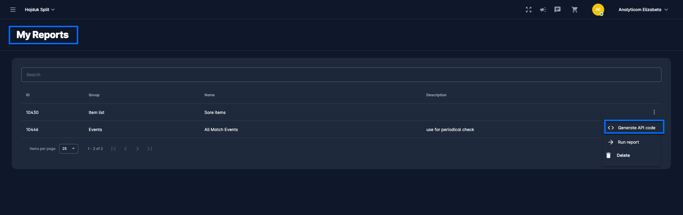 Next, click on the “options” menu at the far right of your selected report and choose to Generate API Code, as shown on the image below. API Code is generated at that moment and also copied to the clipboard, so it can be pasted to your email or browser or any other app.