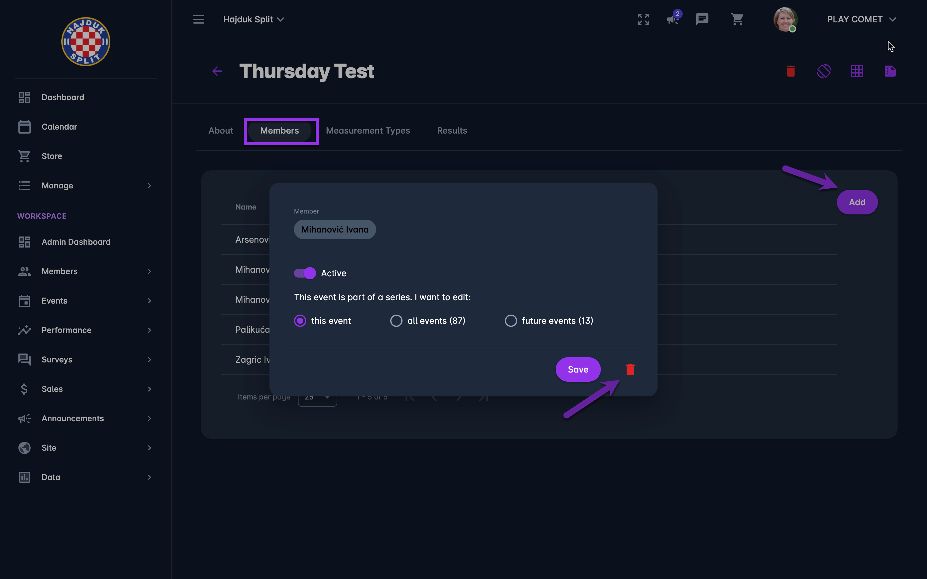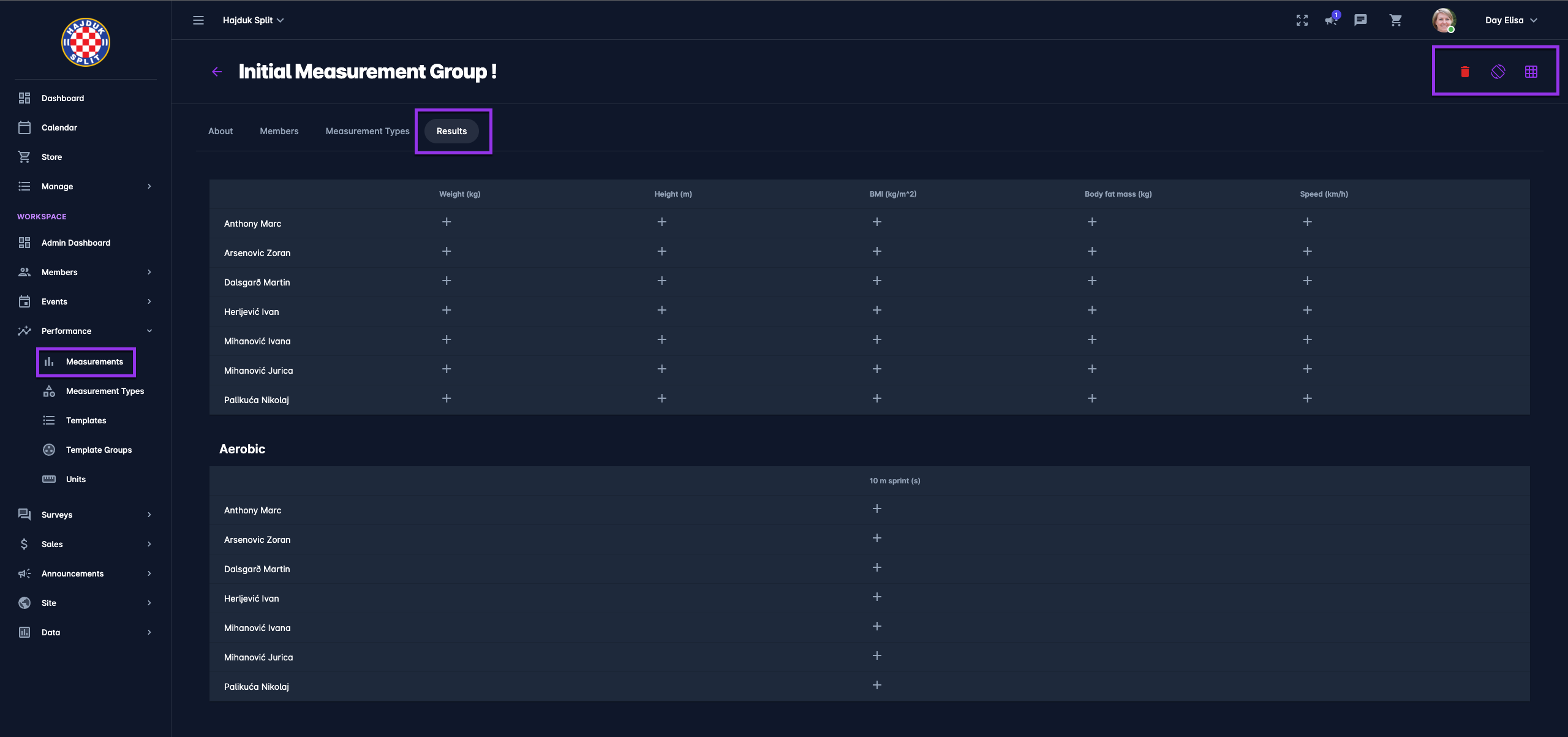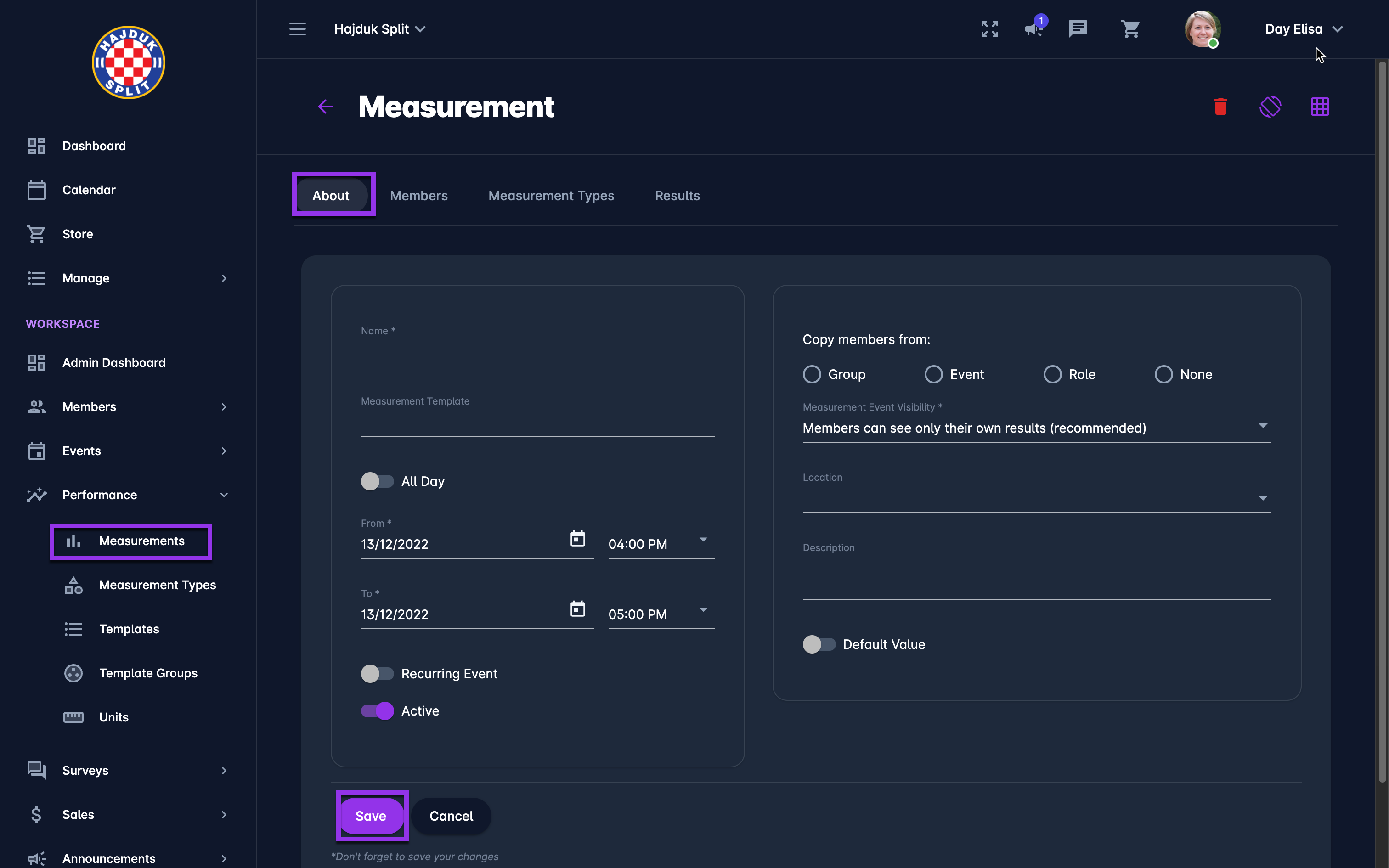 Administrators and Coaches are able to define Measurement Events i.e. these are predefined forms/sets of questions that are used to track specific performance results.