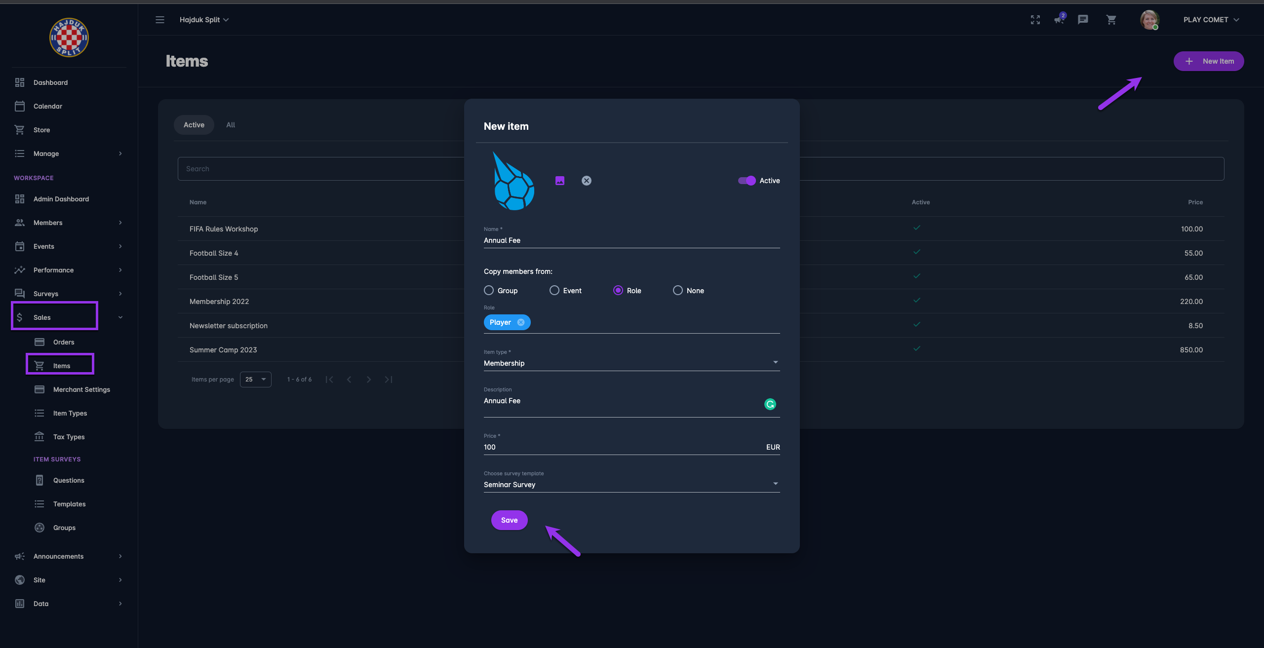 Items are entities of certain type (e.g. Membership, Merchandise, Event, Donation, etc) that can be sold by the Merchant (Club) and purchased by workspace members. For example, participants may need to pay for player memberships, training equipment, various merchandise, summer school, or provide voluntary donations to the club. All of these items are created and configured by the Workspace Admin