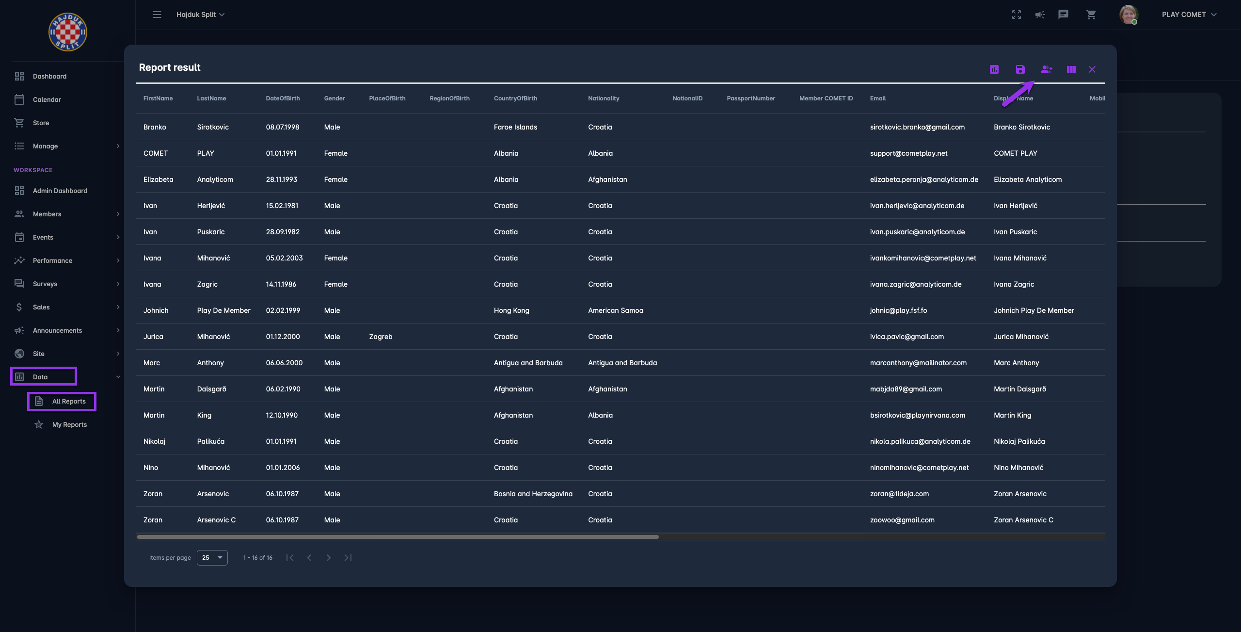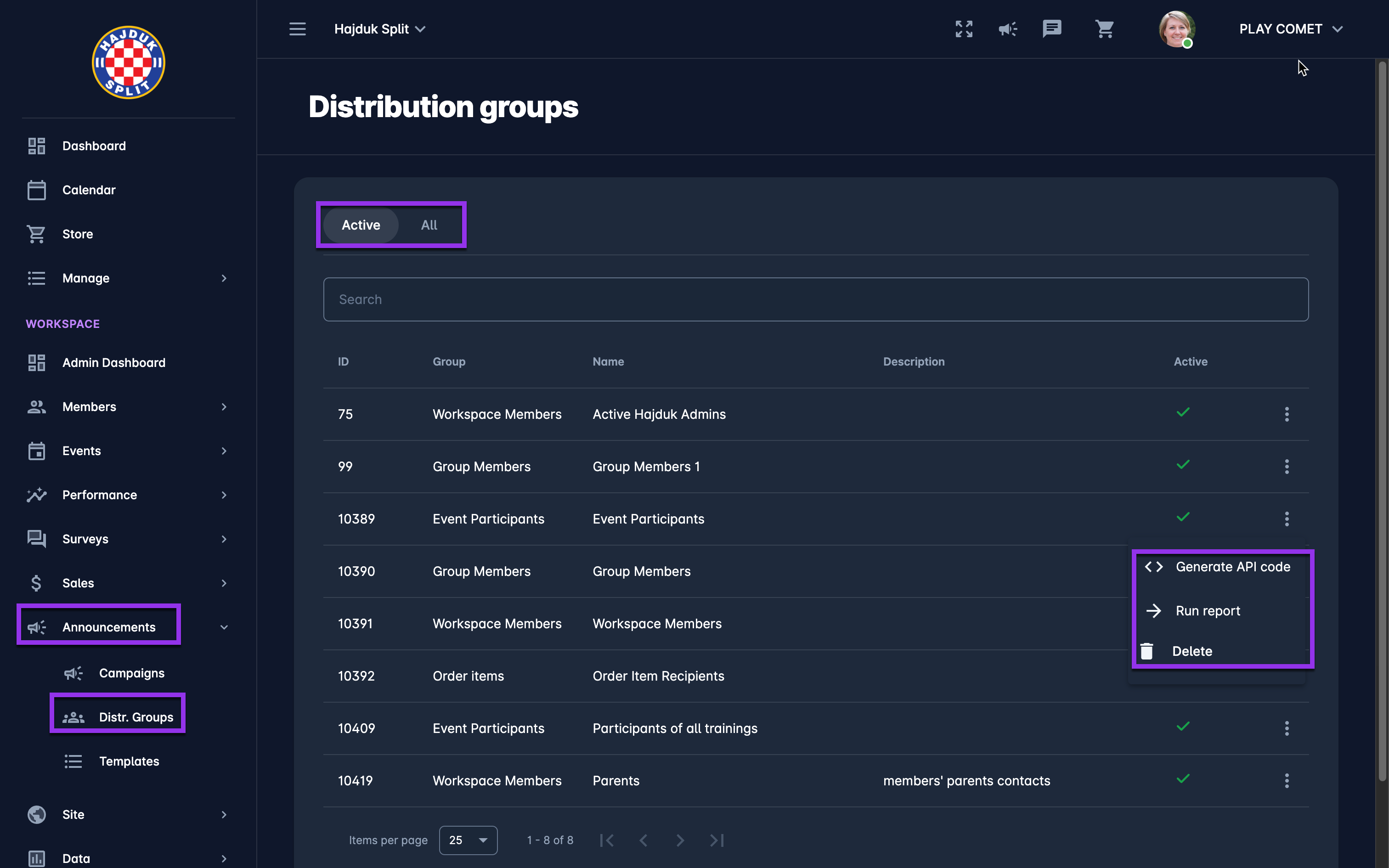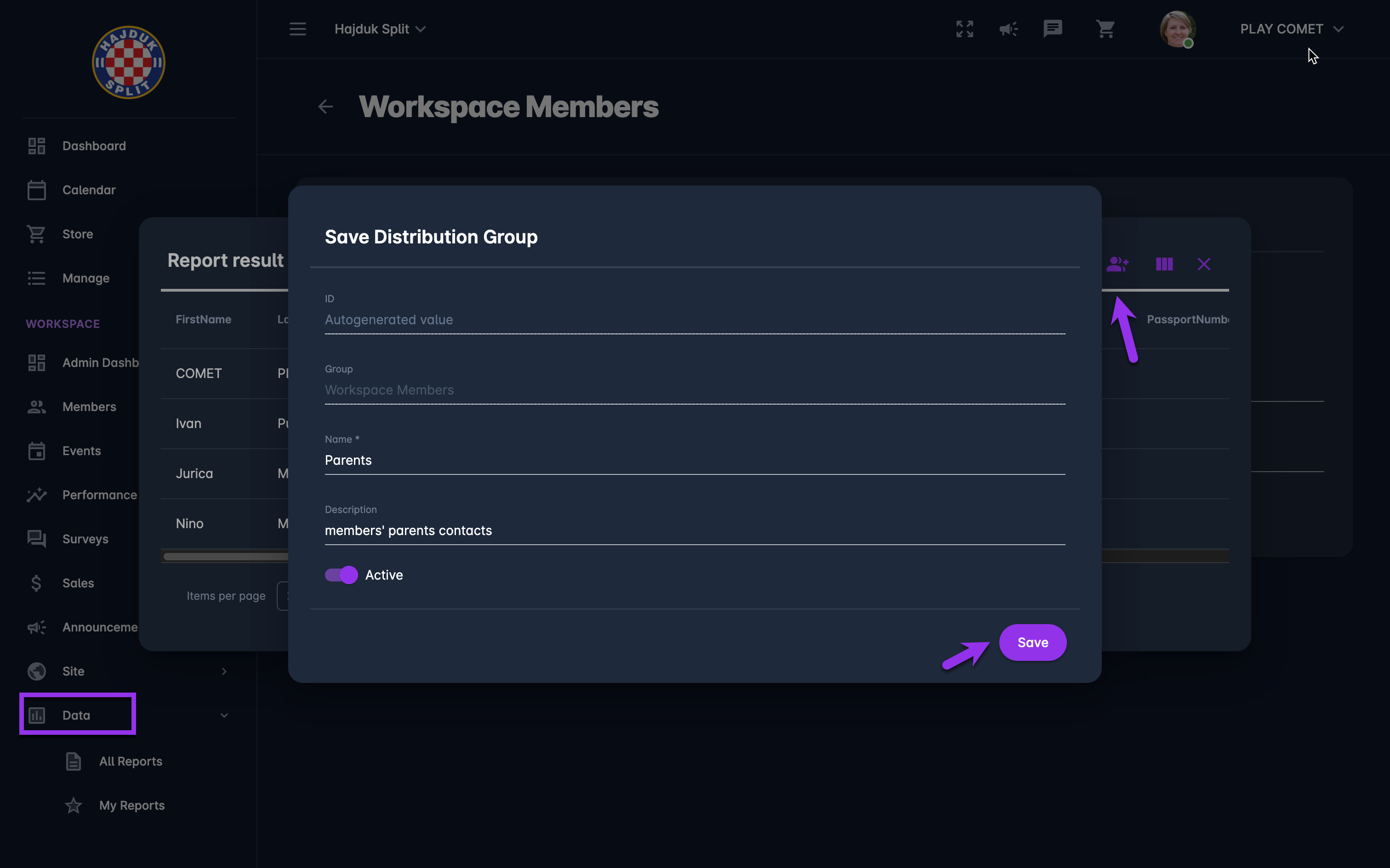 A distribution group can be generated from any COMET Play Data report that contains the display name and e-mail address (Members and Participant reports). Please take into account that such reports will have the Save report as a distribution group button displayed