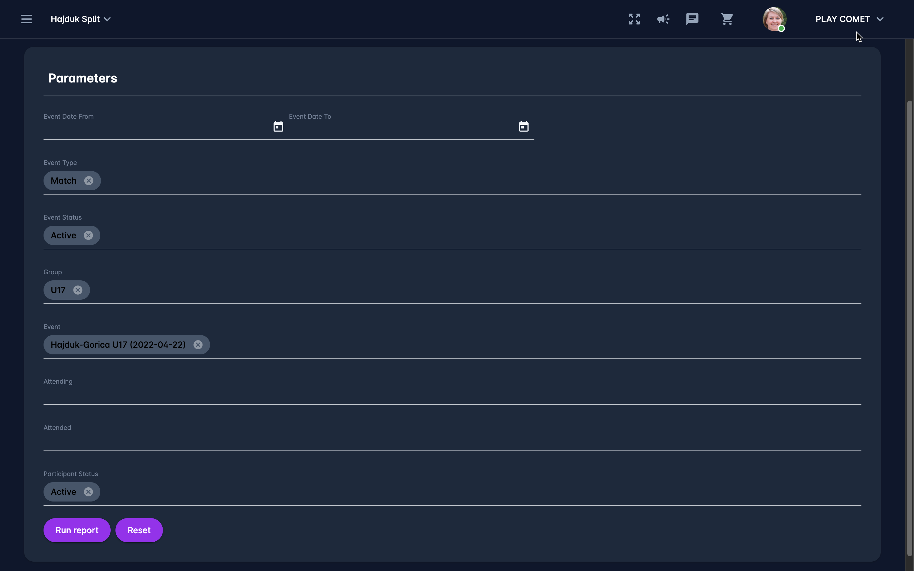 π Check the example below for the scenario in which the user wants to get the Distribution list of all COMET Play Members that have participated in a specific Match (Report ID 201 Event Participants). Parameters will be set as follows