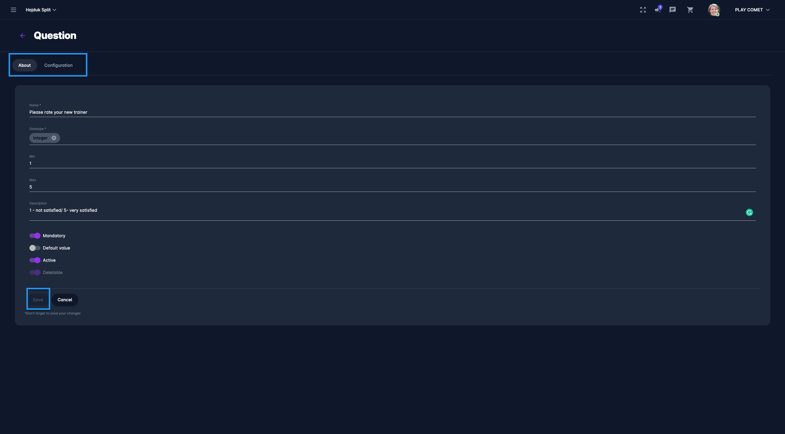 Deletable - the questions that are set as non deletable cannot be deleted by users