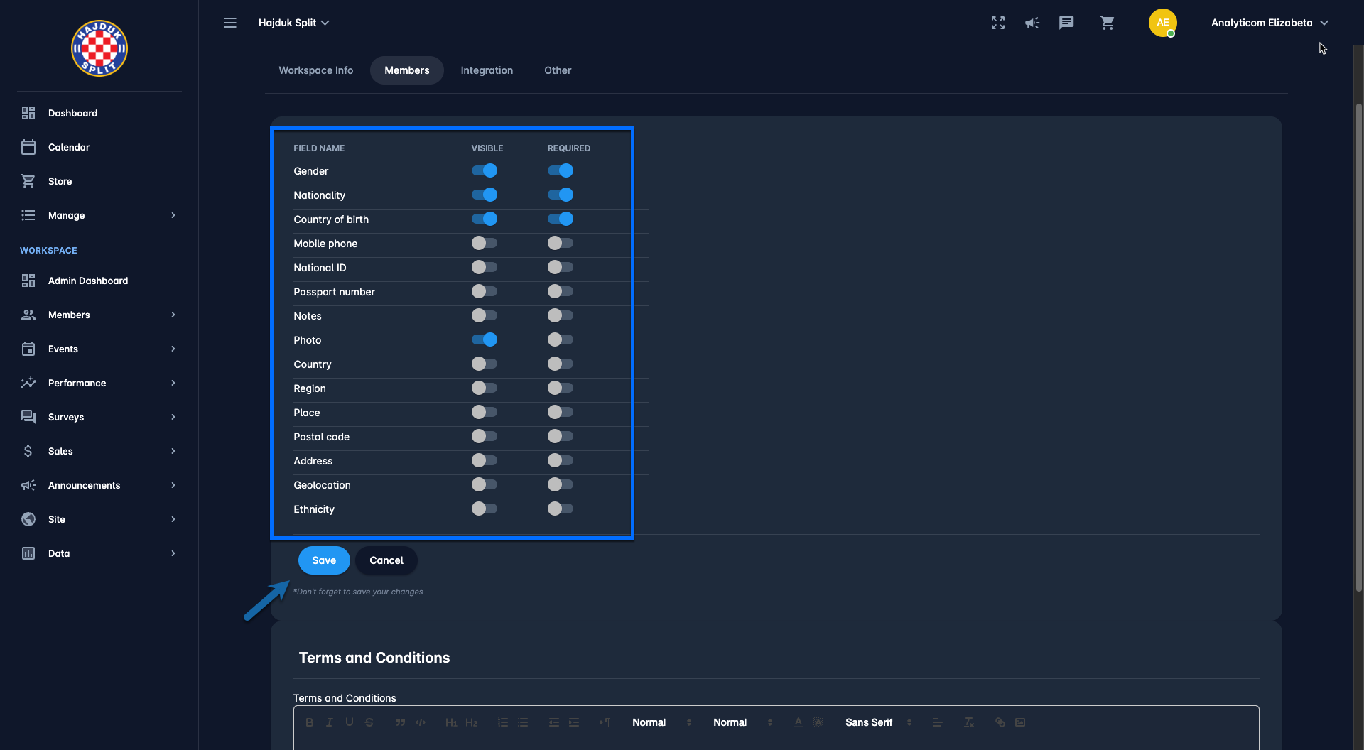 On the Terms and Conditions section, you can add the terms and conditions text that needs to be checked by members