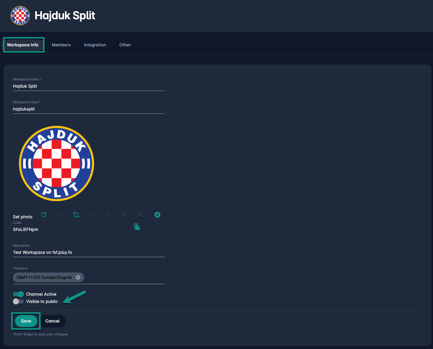 The workspace info tab contains general data of the Workspace that can be edited by COMET PLAY Admin: