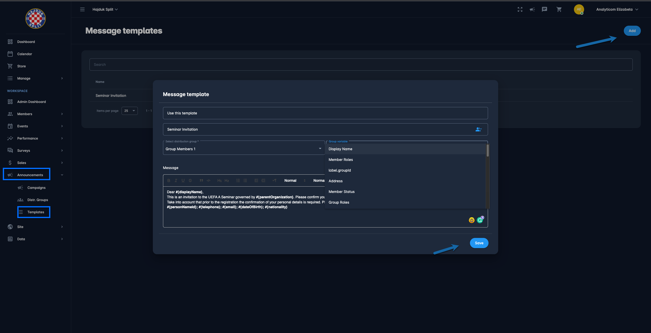 After entering all the Message template details hit 💾 the Save button