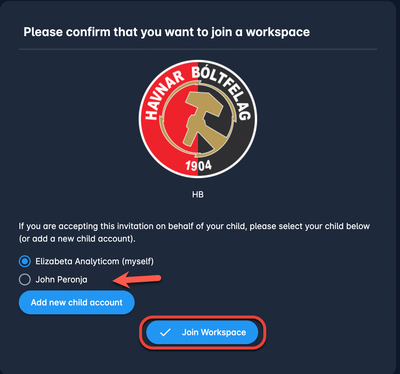 In case you have children accounts linked to your profile you will be able to accept the invitation on behalf of your child or create a new child account* directly from this window