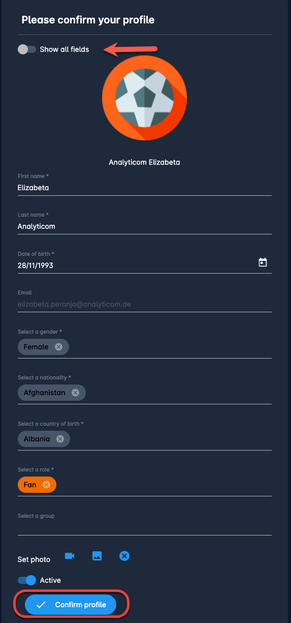If you want to enter more data at this point of registration you can switch on Show all fields button which will display more data fields.