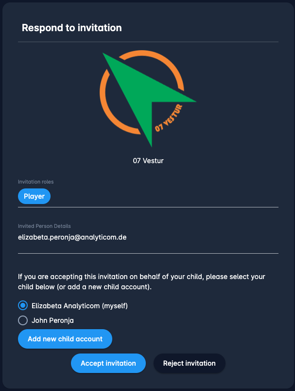 In case you have children accounts linked to your profile you will be able to accept the invitation on behalf of your child or create a new child account* directly from the Invitation display