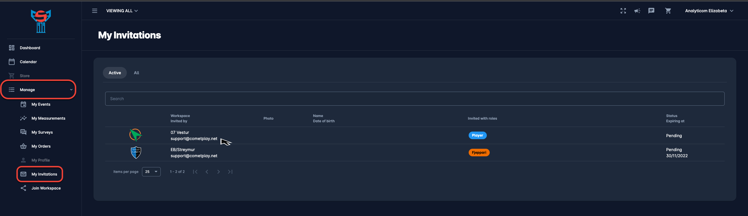 The list of your invitations can also be found in the My Invitations menu which is quickly accessible from the left nav bar under the 🟰 Manage menu