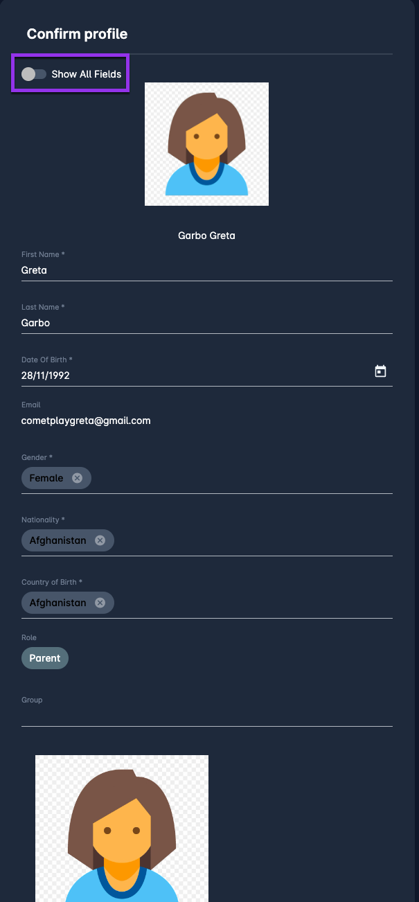 If you want to enter more data at this point of registration you can switch on Show all fields button which will display more data fields.
