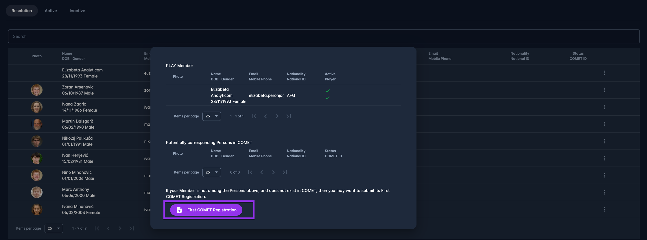 If the player is really active, but there is no match in the Potential corresponding persons list, i.e. the player does not exist in COMET, you should submit the First COMET Registration: