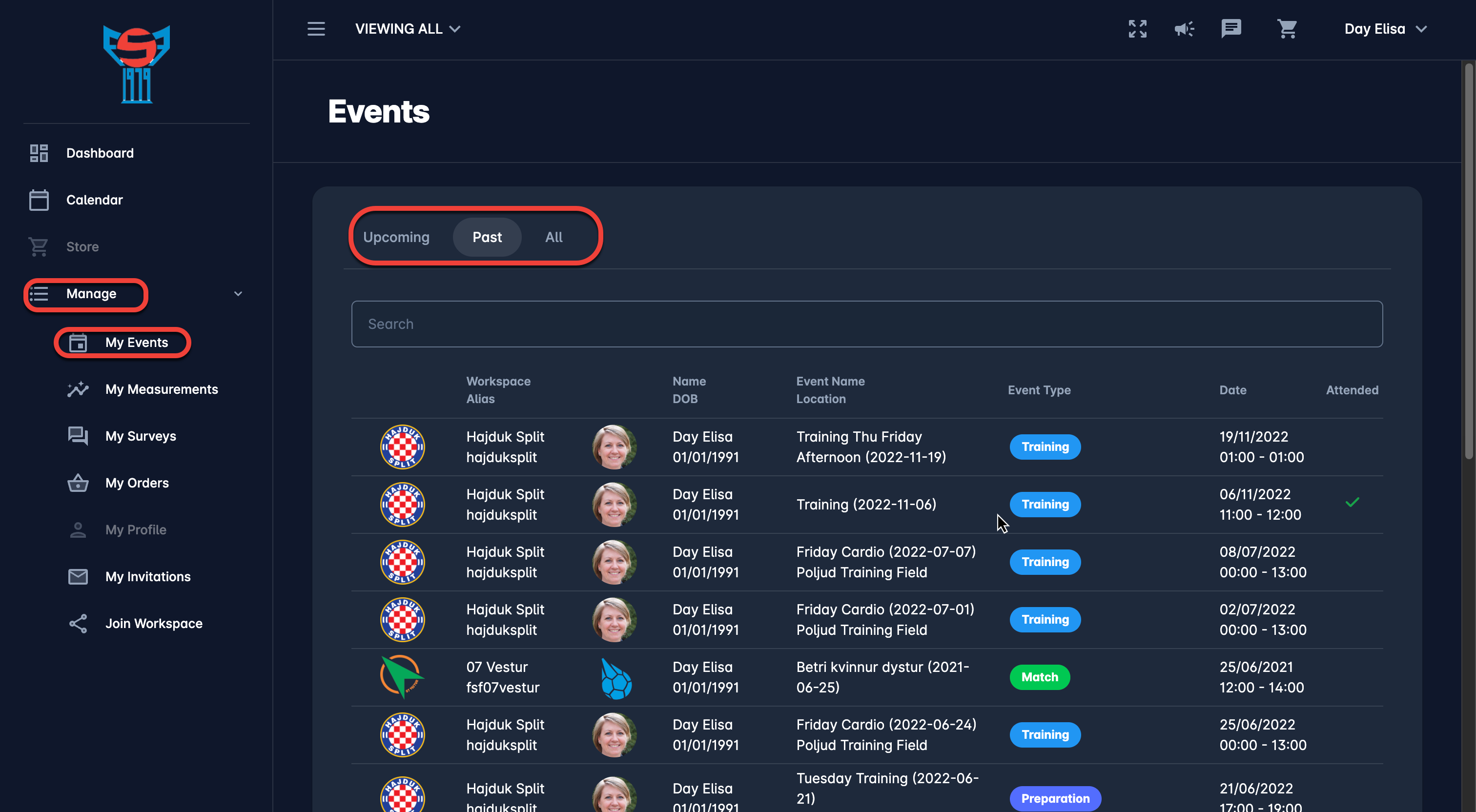Events can be e.g. recurring weekly trainings, individual team meetings, summer camps, or any other events organized in your workspace. In the My Events Menu, you will be able to see the list of the events that you have been added to/ participated in.