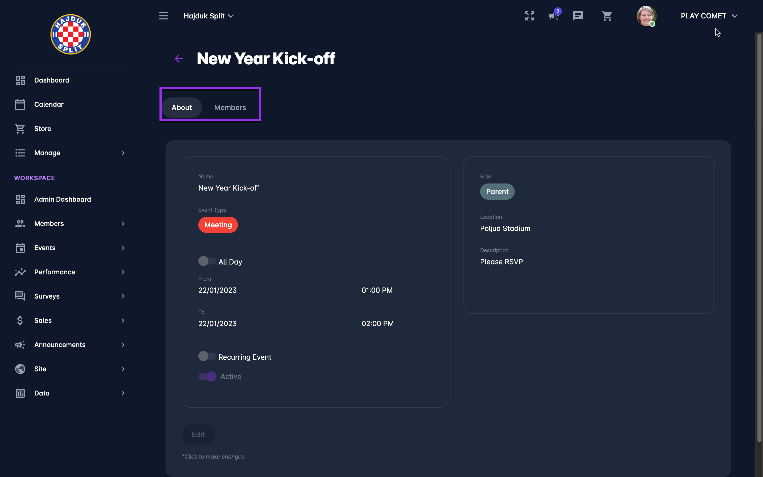 On the About tab, you are able to review the general information such as name, event type, time, activity status, location, etc.