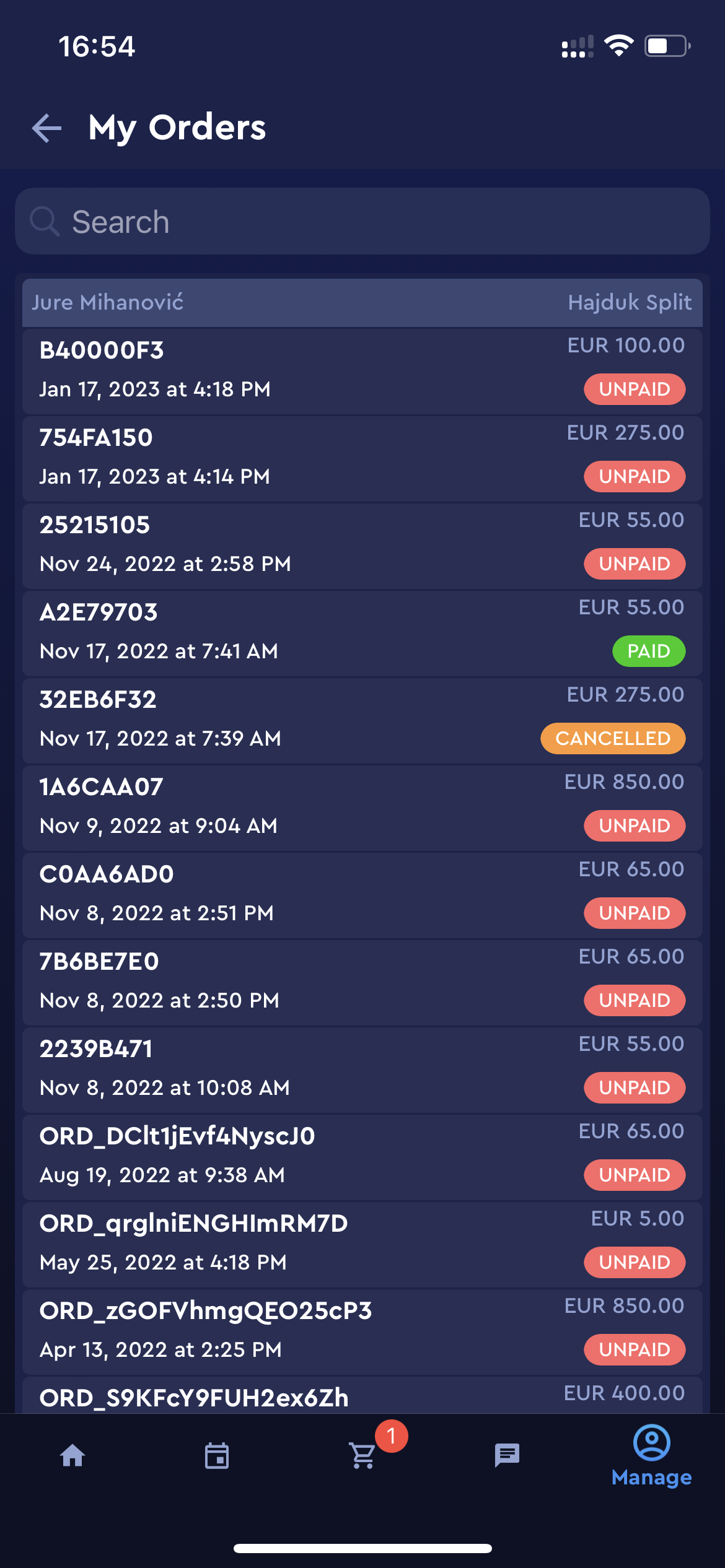 This opens the list of all your orders with the following information: