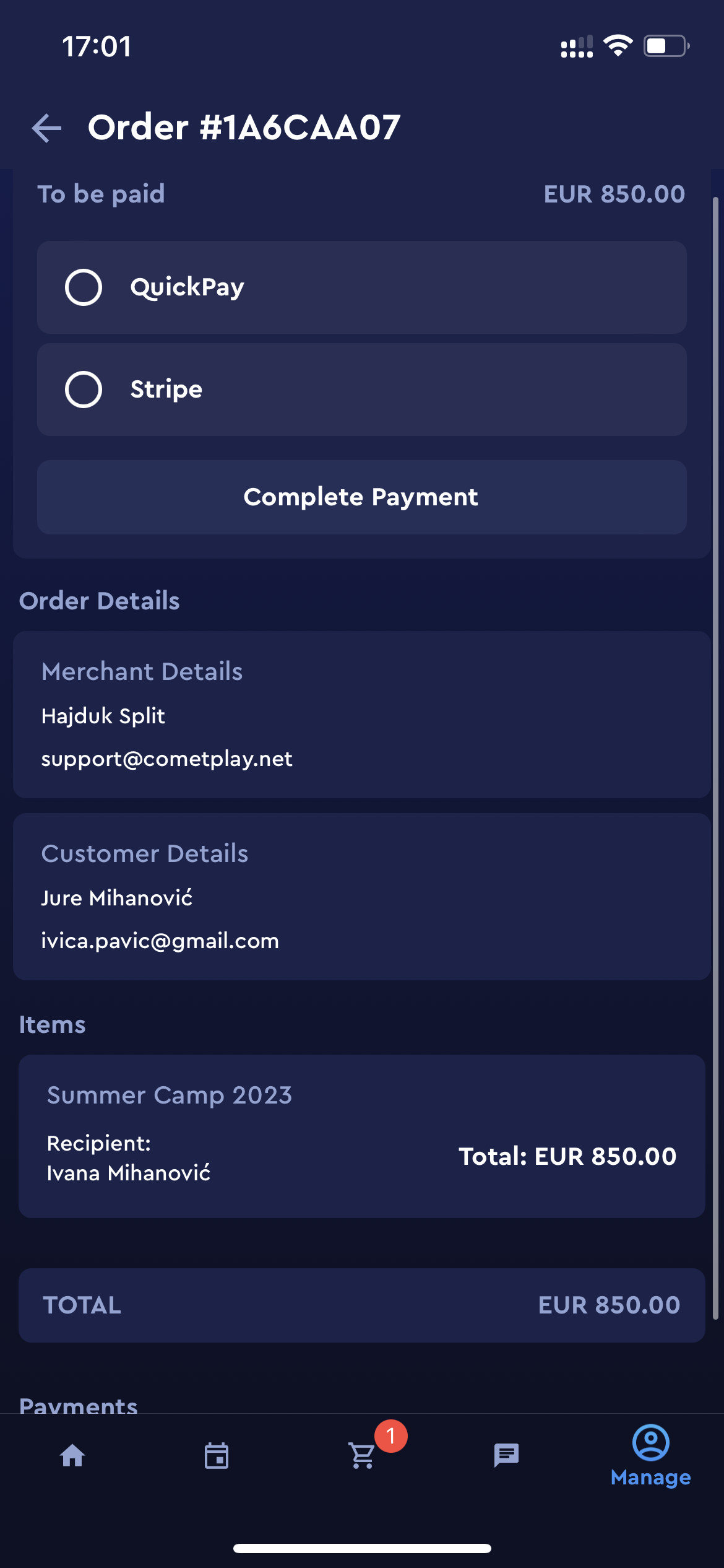 A click on the order from the list will redirect you to the Order details page. On this page, you are able to check all the details of the order, purchased item, and payment detail or to proceed with the non-manual payment option (if you have changed your mind).