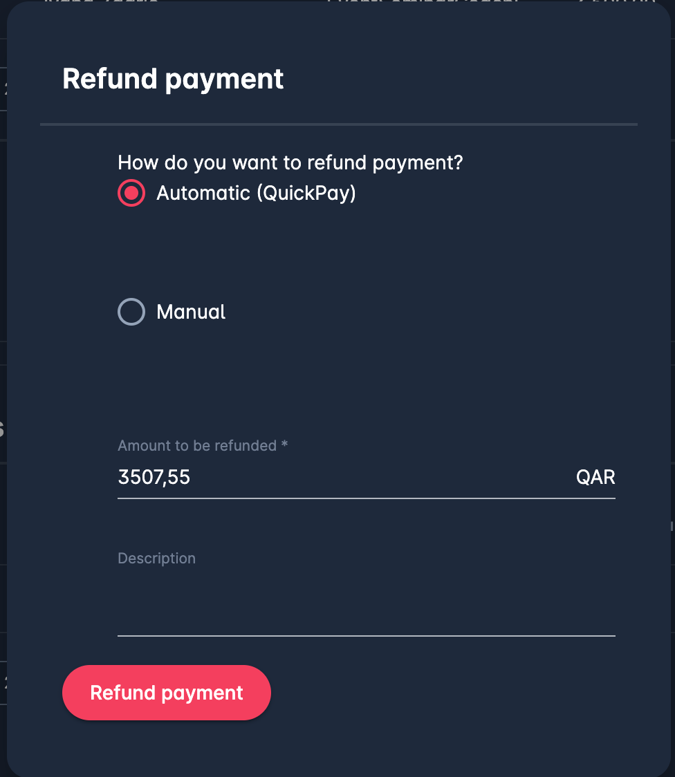 Select the refund amount and options (i.e. whether the payment will be returned automatically or manually)