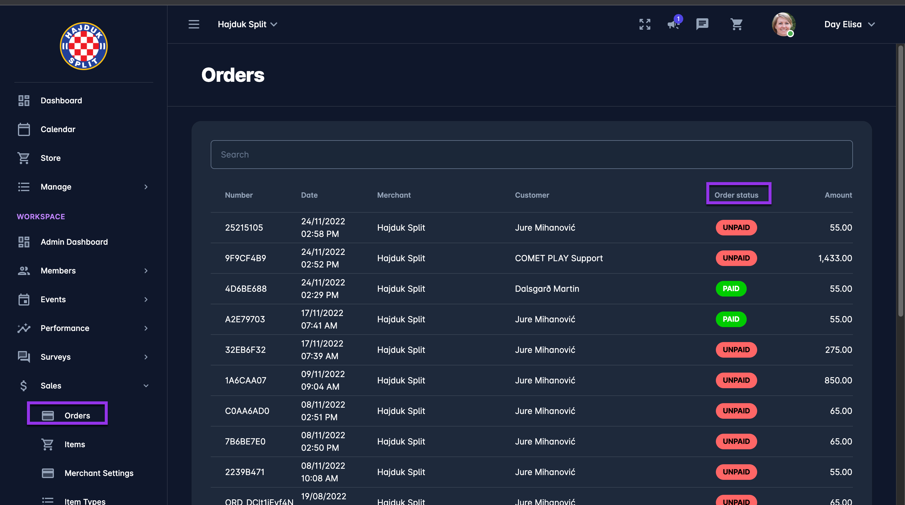 The orders menu displays the list of all orders of your Workspace; this menu displays the list of ordered items with the indication of payment status: PAID, UNPAID, PARTIALLY PAID and CANCELLED.