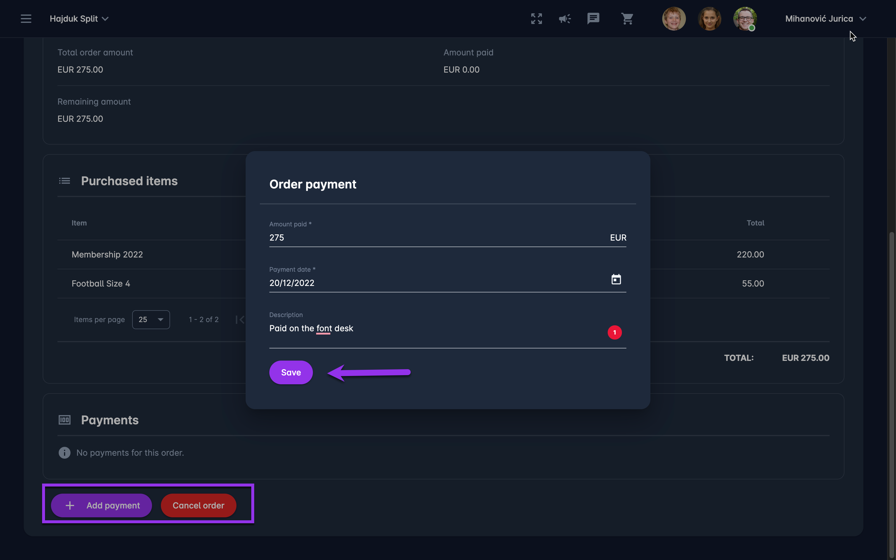 To the make status transition UNPAID → PAID, please click on the ➕ Add payment button and fill in the following data: