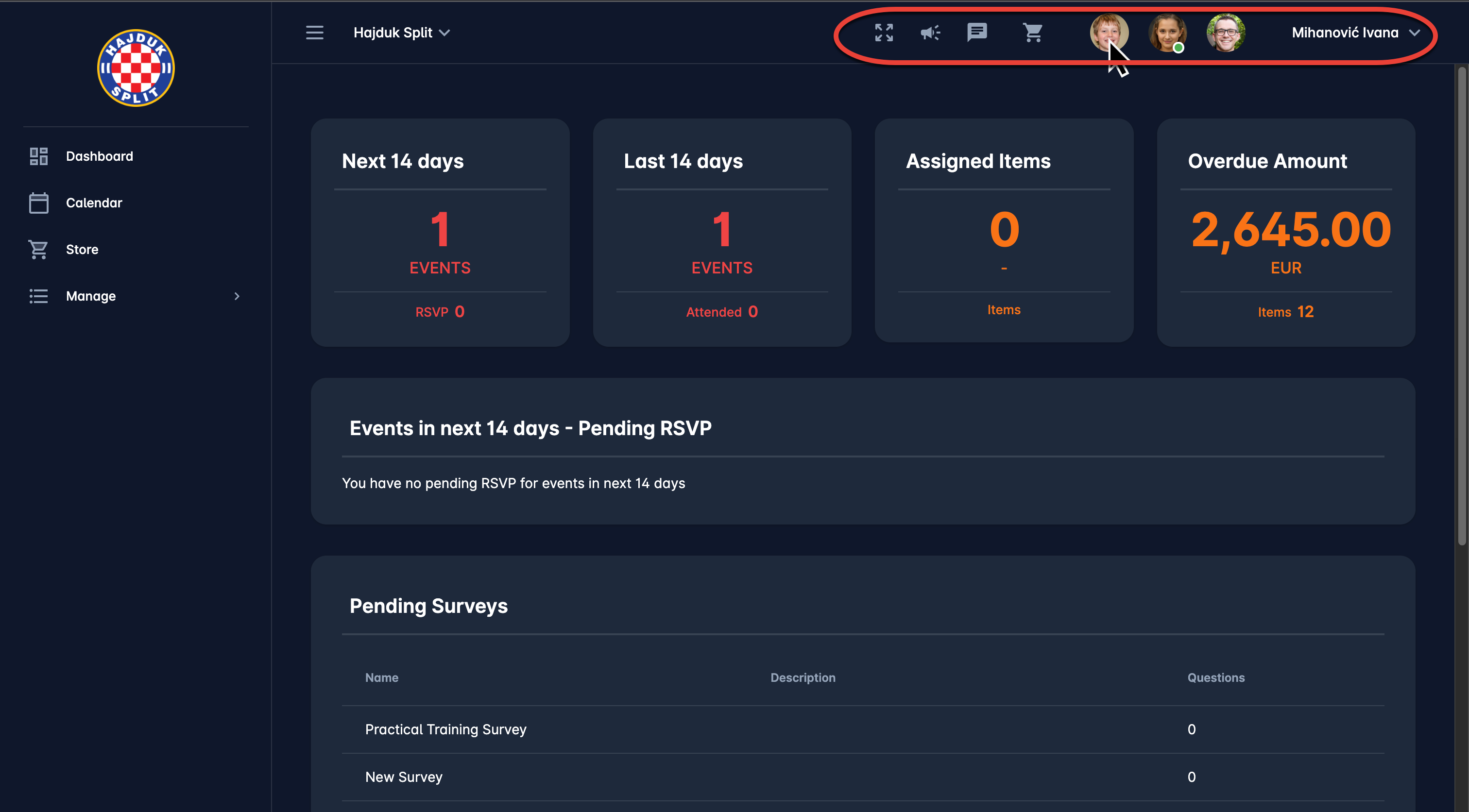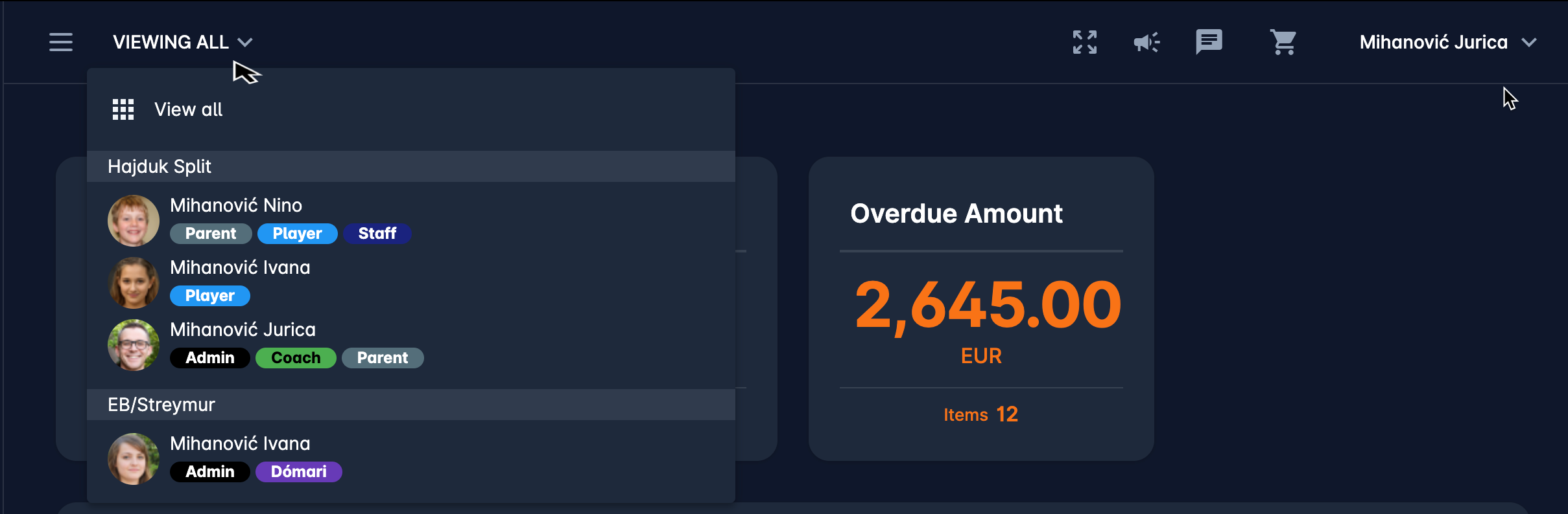 If the user has more than one active profile (e.g. related children profiles) in the chosen workspace, a list of related member profiles in that particular workspace is displayed in the upper right corner.