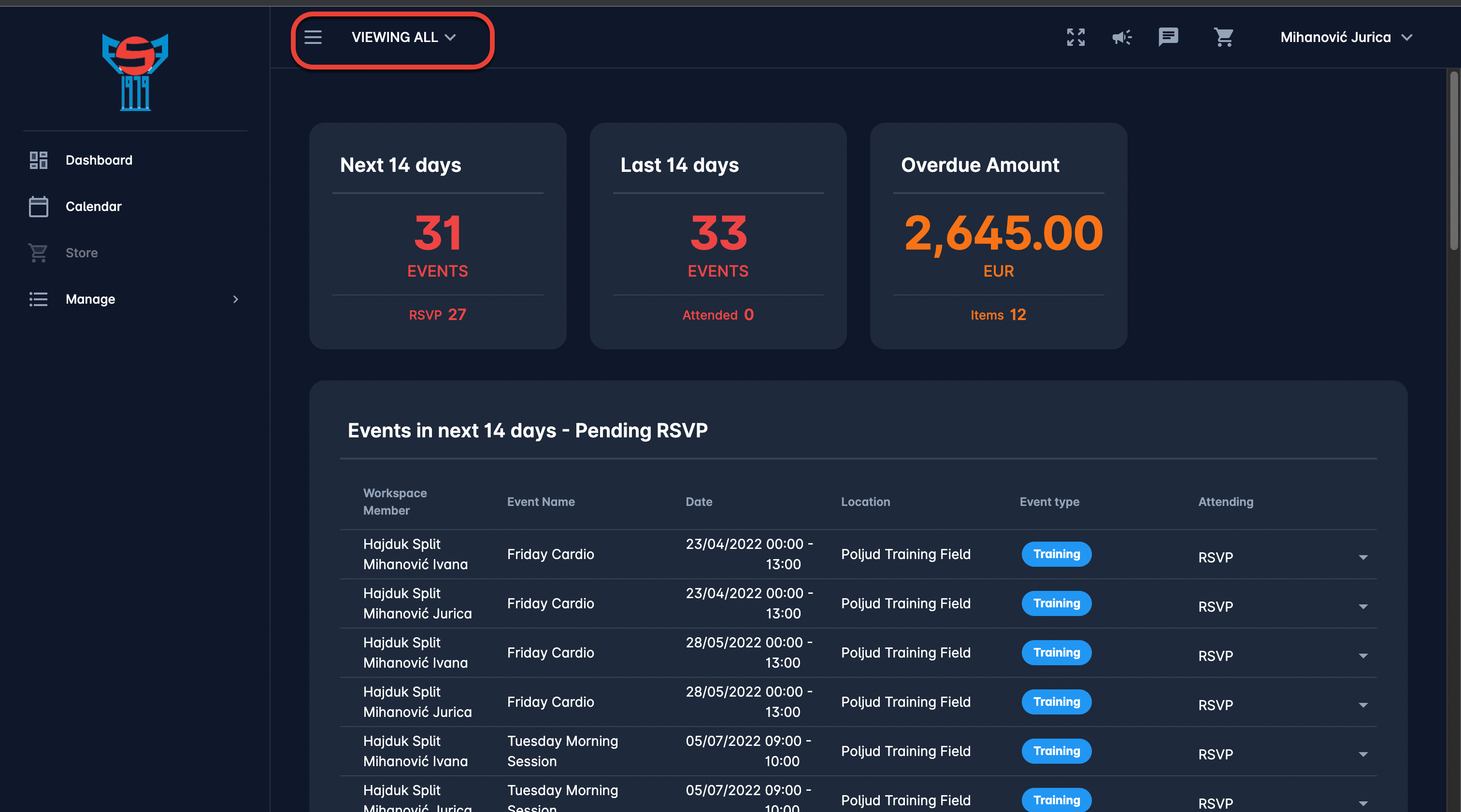 When a specific member profile is selected, then only the information linked to that specific member in that specific workspace will be displayed. The Store and My Profile menus will be displayed only when a specific workspace profile is selected.