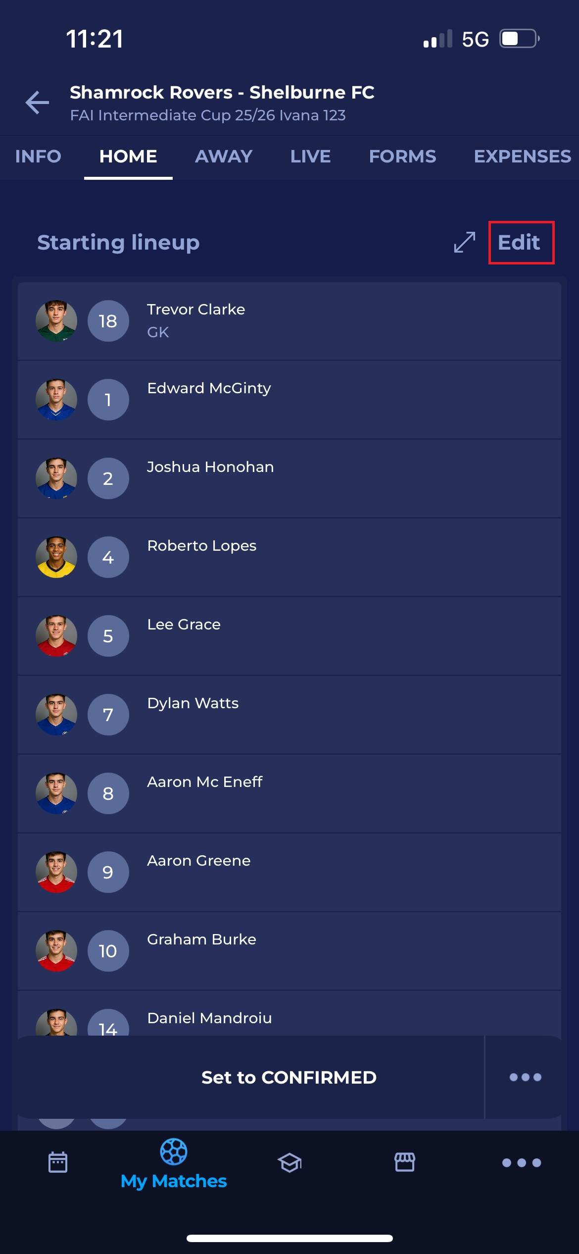 If you need to edit the lineup by removing the players from the list or simply updating their shirt number, tap the Edit button at the top right corner of the screen, swipe left to Lineup, and tap on the player’s name.