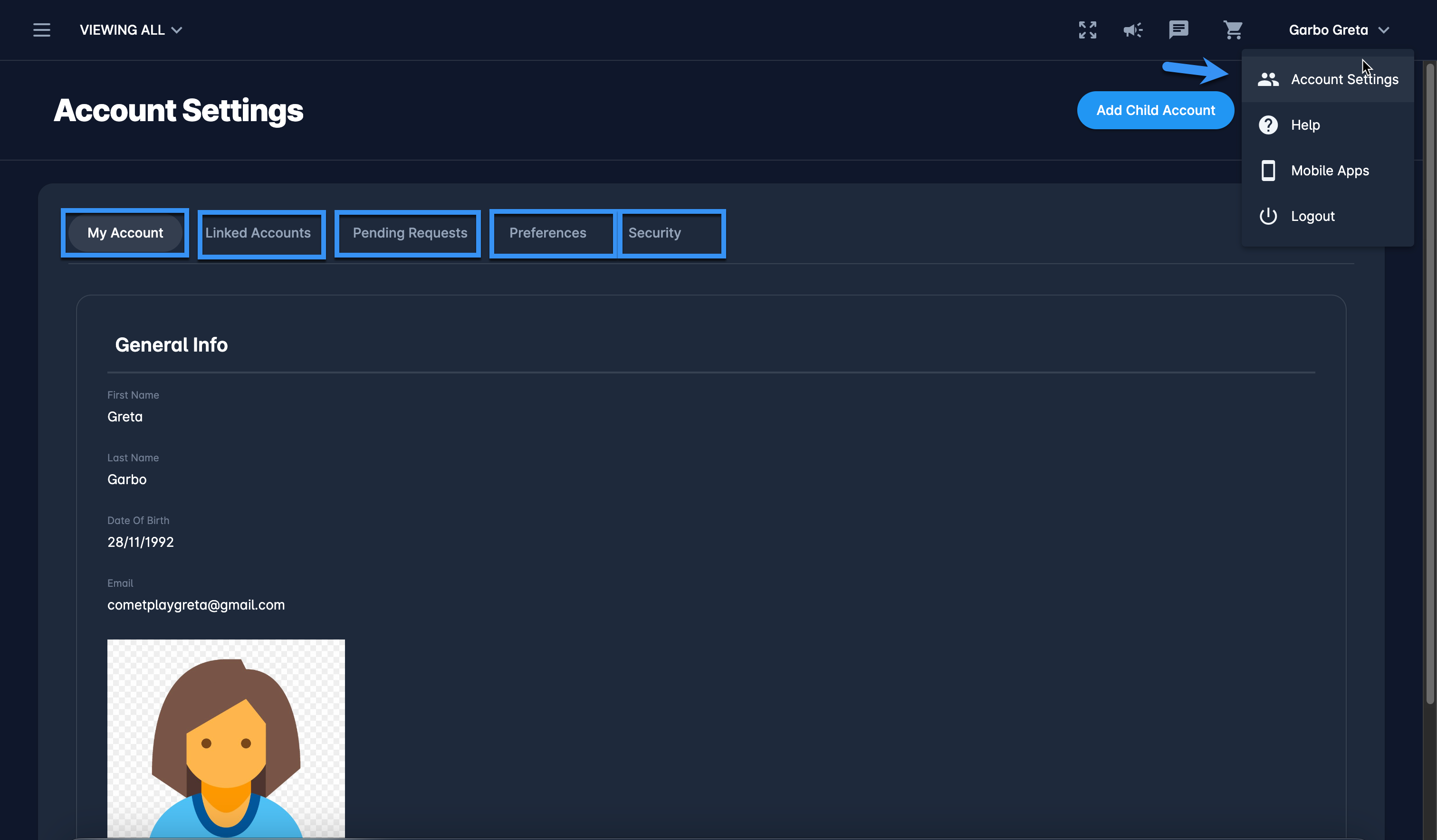 Linked Accounts tab - lists all accounts that are connected to your Profile. In this tab, you will be able to see all of the profiles that are linked to your profile in parent/guardian and child relations: