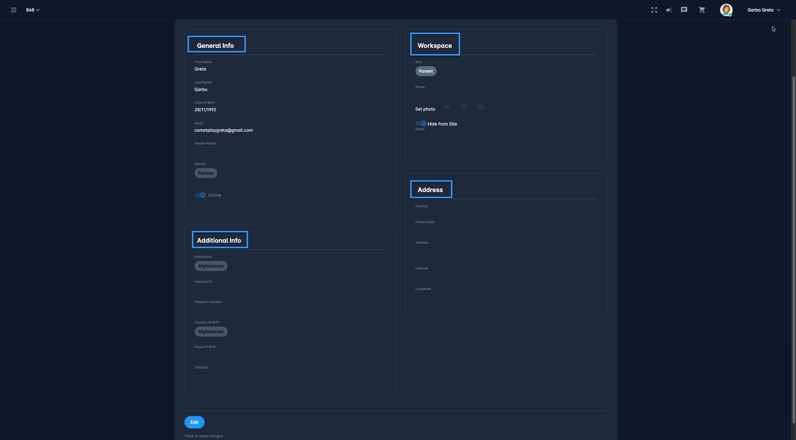 General info - First Name, DOB, Email, Gender, Activity status