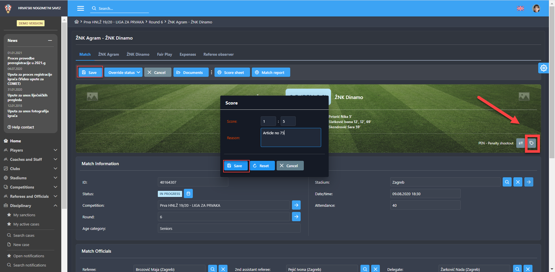 Insert a new score and a reason for which it was changed and press the 💾 Save button
