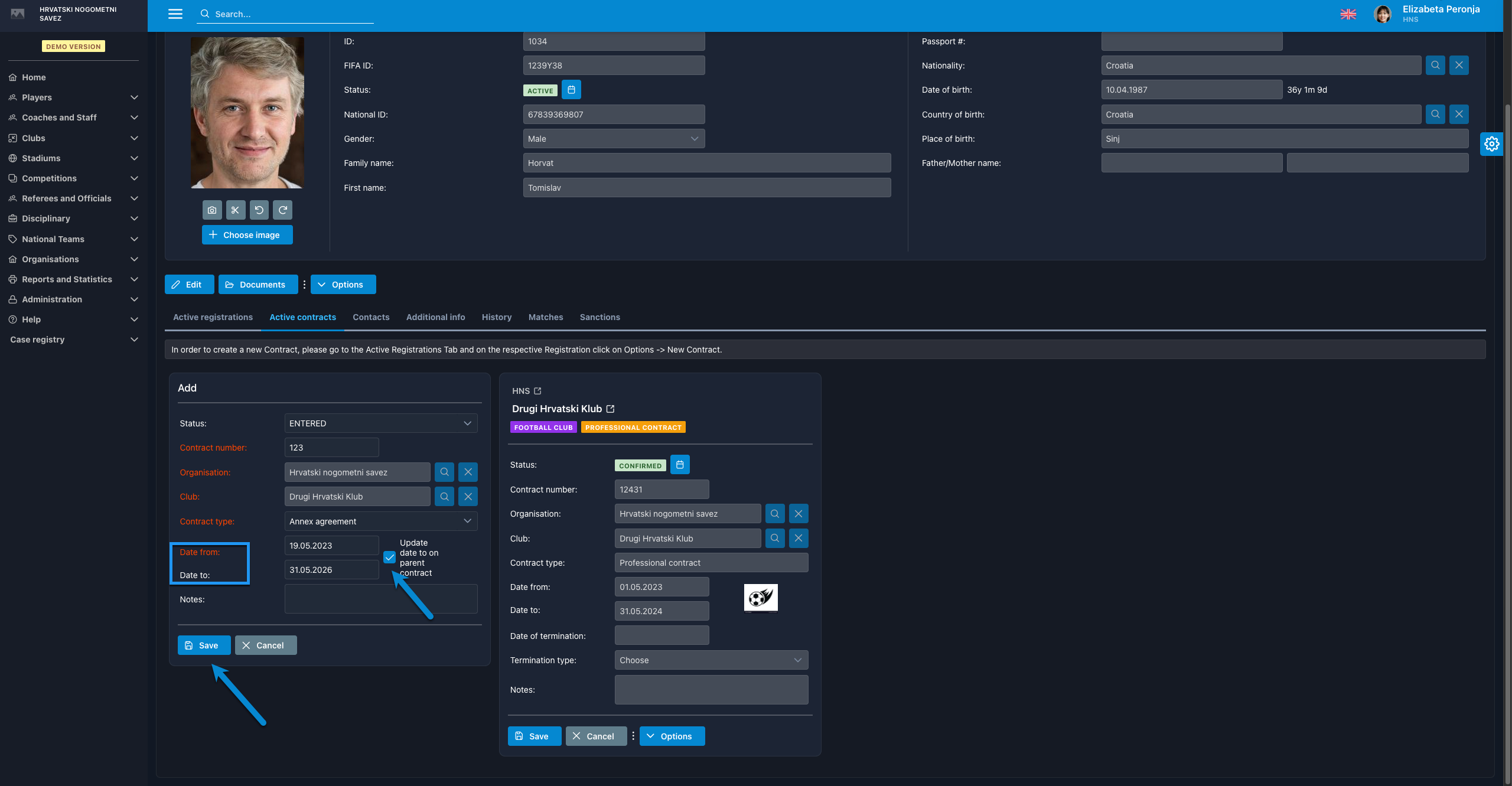 Note that the name of the association, the name of the club and a contract type are automatically copied from the main contract details