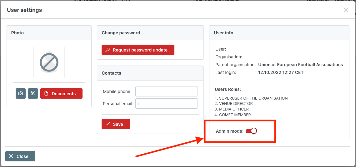 Authorized users can turn on and off Admin mode by going to their User settings page and clicking the new option added to the screen. For other users, this option will not be visible.