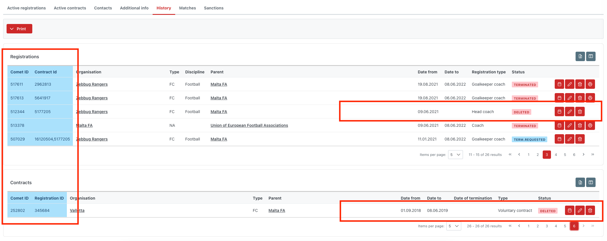 History Tab: COMET ID of the Registration (or Contract), and the COMET ID of the corresponding referenced entity, e.g. Contract (or Registration) will be shown in Admin Mode. Also, DELETED entities will be shown in Admin Mode.