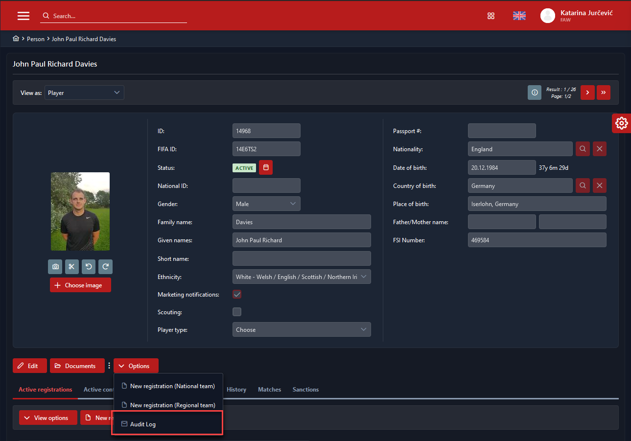 The report available from “Export to Excel”, described above, can be generated directly from the Comet UI. For any of the above-mentioned entities, the level Superuser can obtain the same Excel file by opening the entity-specific screen, clicking on Options, and selecting Audit Log. For example, if you are investigating changes made to a player’s date of birth or a recent registration, you can open the profile of this player, click on the Options button (located below the photo), and click on Audit Log. The same option is available on the profile of any Organization, Competition, Match, Disciplinary case or User.