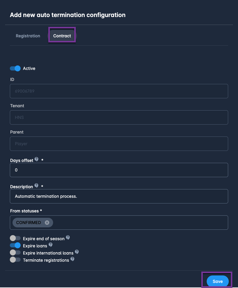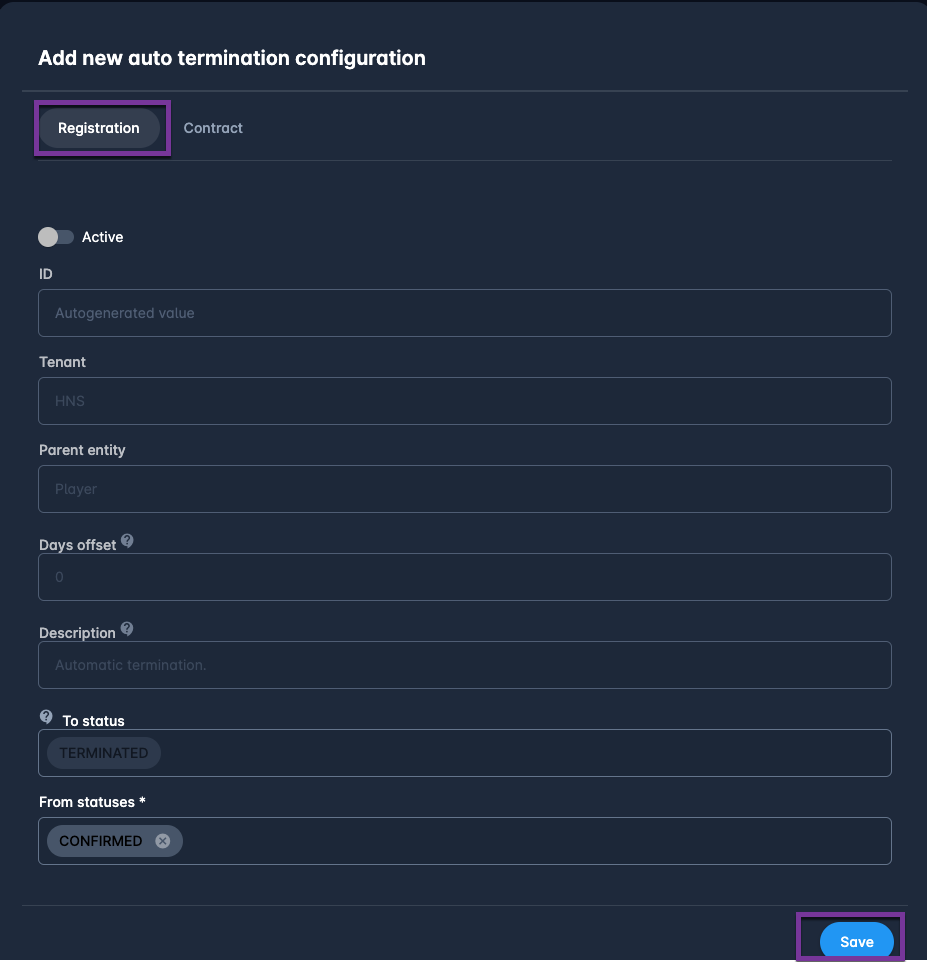This opens a pop-up screen to configure auto terminations with two tabs: Registrations and Contract.