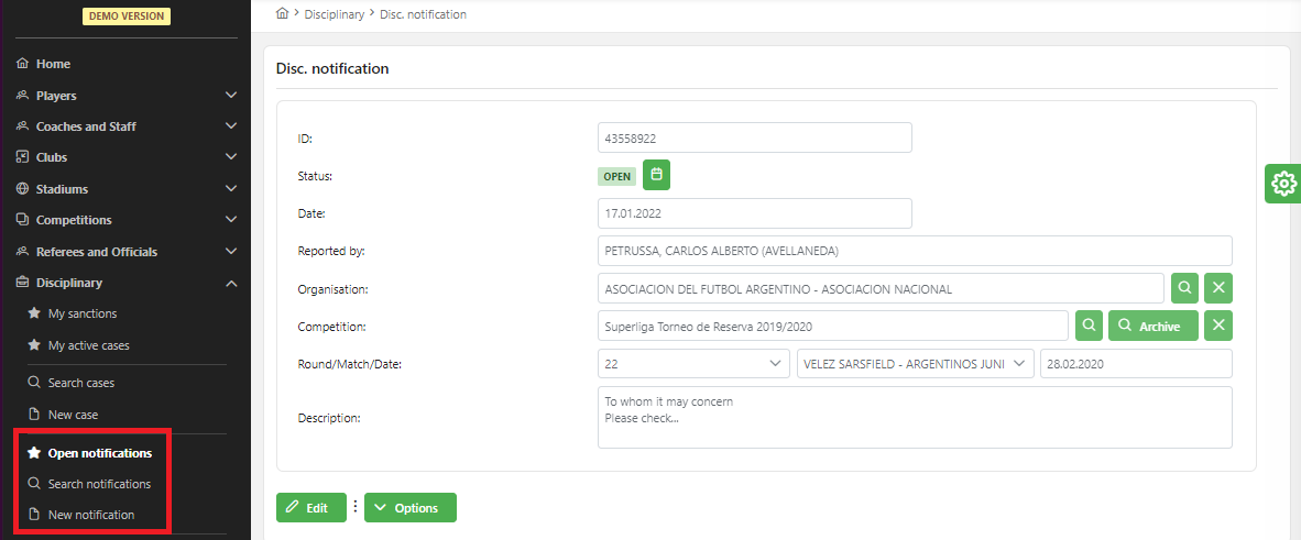 If the option "Disciplinary committee intervention" is checked, upon changing match status to PLAYED, the disciplinary notification will be automatically created with match summary text (and incidents of both match clubs) copied into description of the new notification.