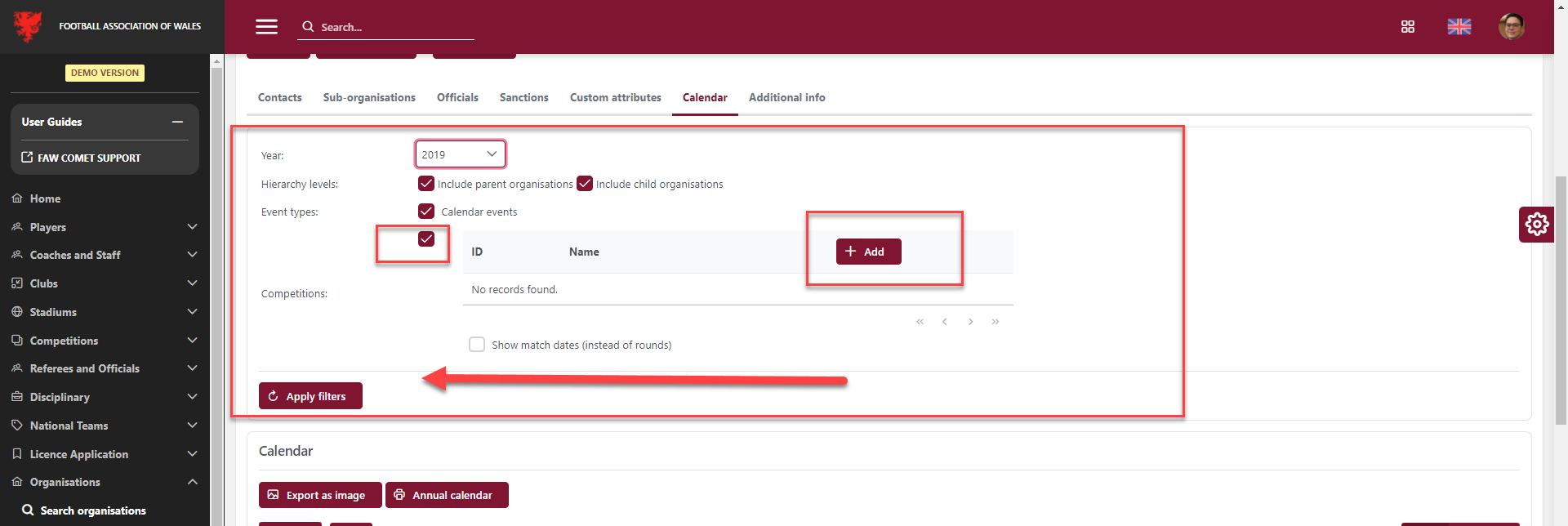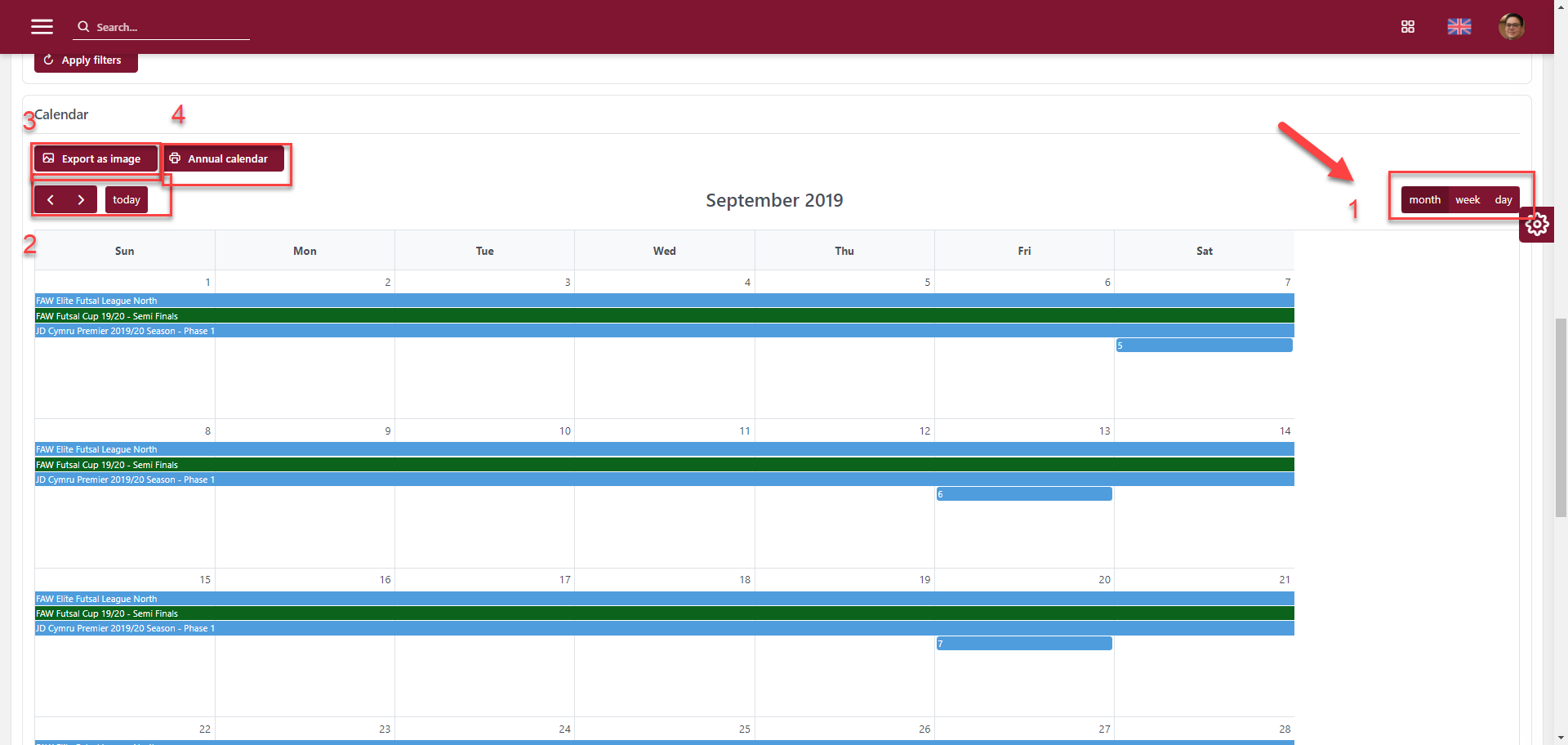 📅 After any changes to the selections, make sure to click the Apply filters button and the calendar will be refreshed with the latest information.