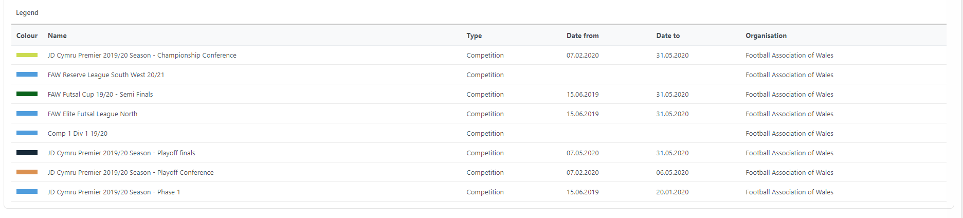 Below the calendar there is a legend, explaining all the events previously entered into the system.