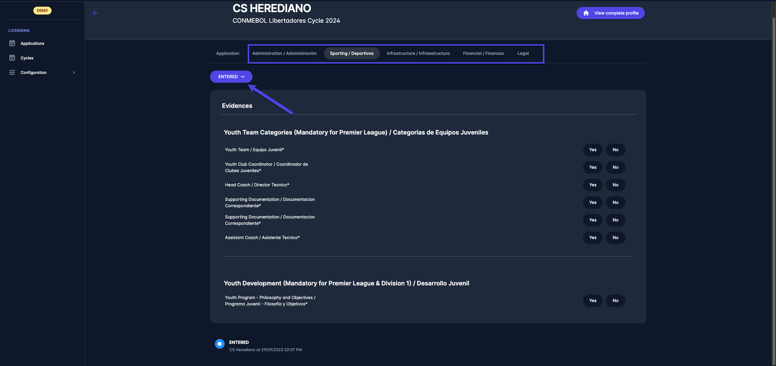 Depending on the Application Type or the Application Decision Status of the Licensing Cycle, on the Status Panel, you can change/inspect the application status of the club: