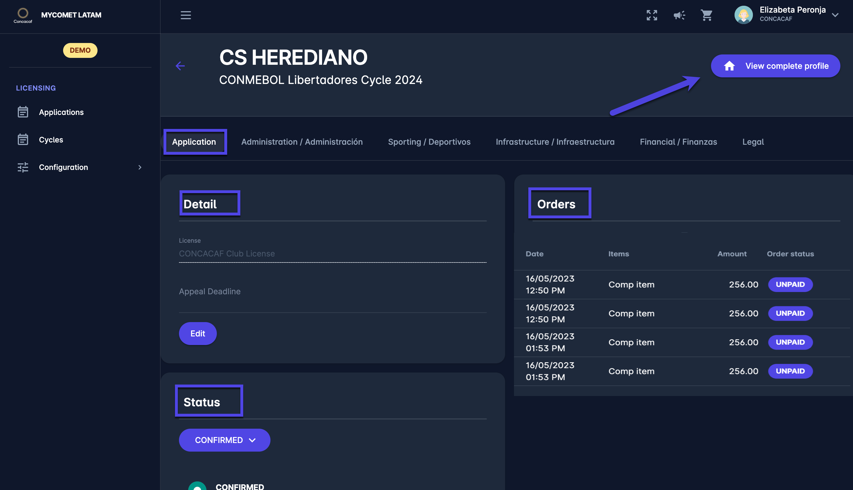 The application tab contains general information relevant to Licensing: club details, application status, and payment order information.
