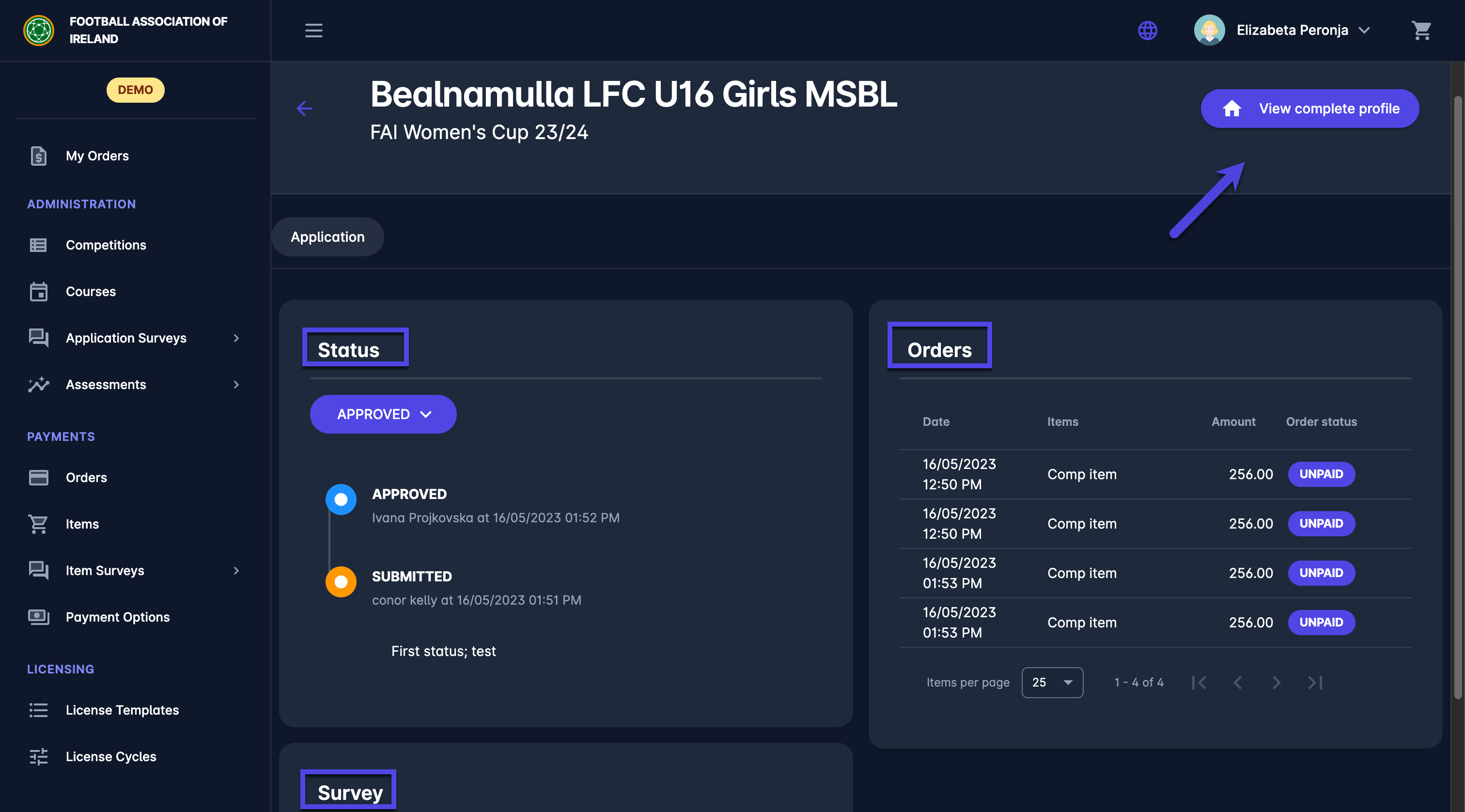 From the Club profile, you are able to adjust the application status, review the application survey and access the payment order details