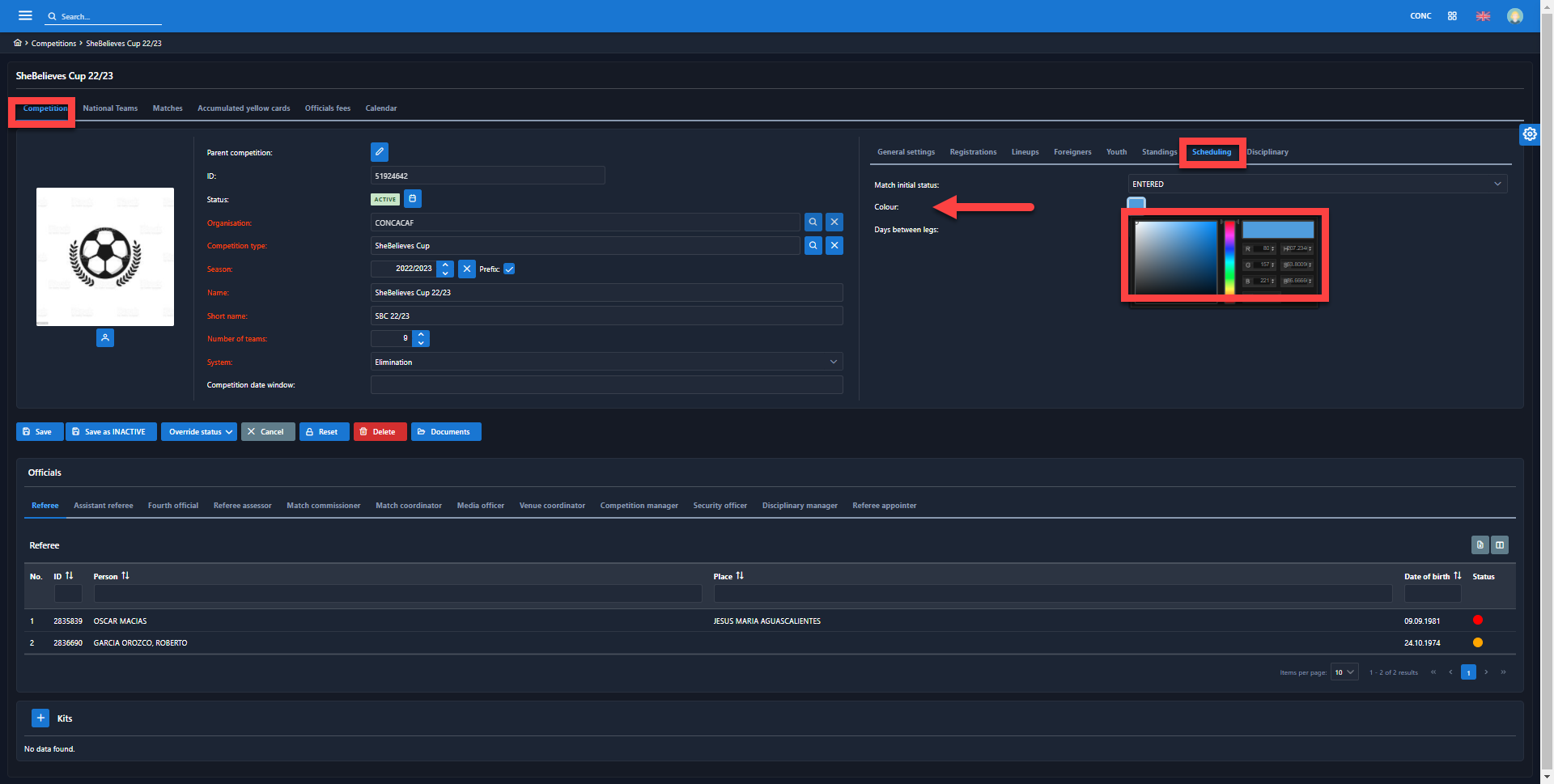 While creating the Competition, there is a functionality that enables you to select the colour of the Competition so that all the matches of the respective competition appear on the calendar marked in a previously selected colour.