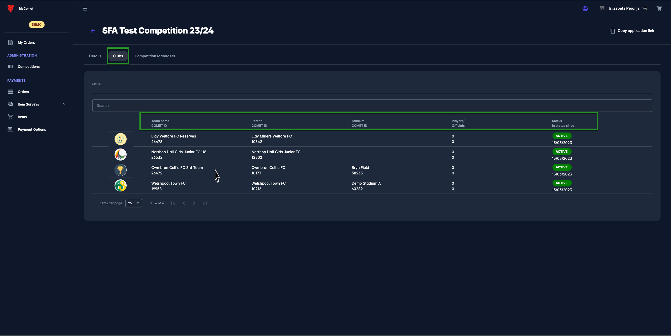 The Clubs tab is displayed on all competitions regardless of the selected Application type. The Clubs tab displays the list of all clubs/teams in the competition, i.e. list of all clubs with the indication of their application status. The list consists of the following details: