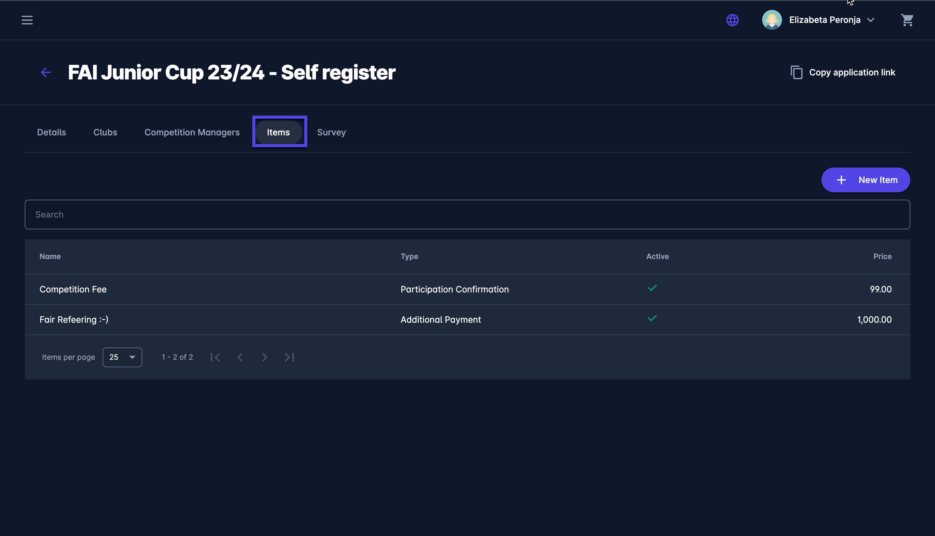 If Pay after approval, Just Pay, or Pay Later is selected as the Application Mode when editing a new competition, the Items tab will be displayed on the competition profile.
