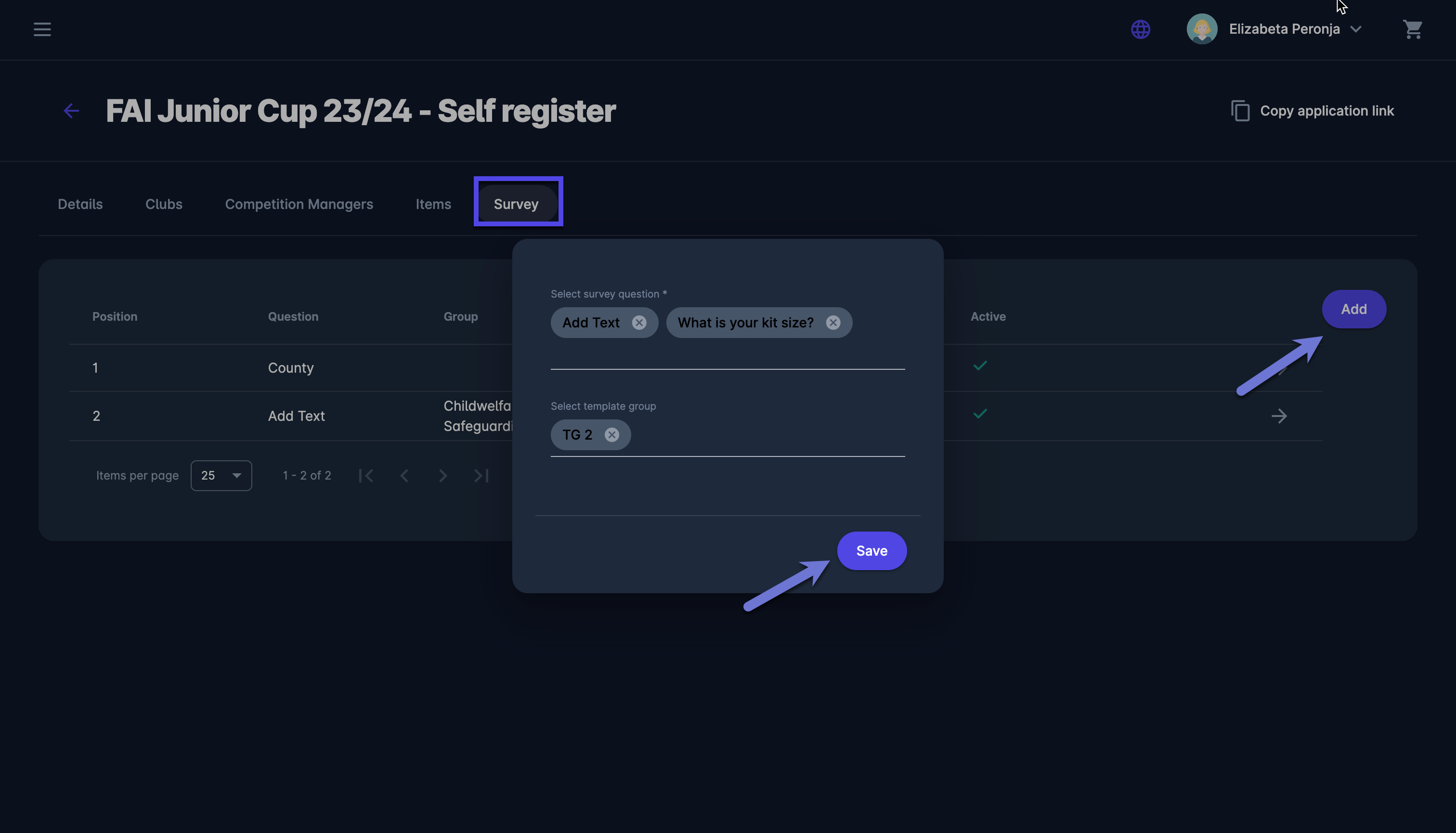 On the Survey tab, you can review the survey questions and add a new survey question. This feature is used if there is a need for clubs to fill in the specific survey form (i.e. answer the questions/ provide specific info) prior to applying to the competition.