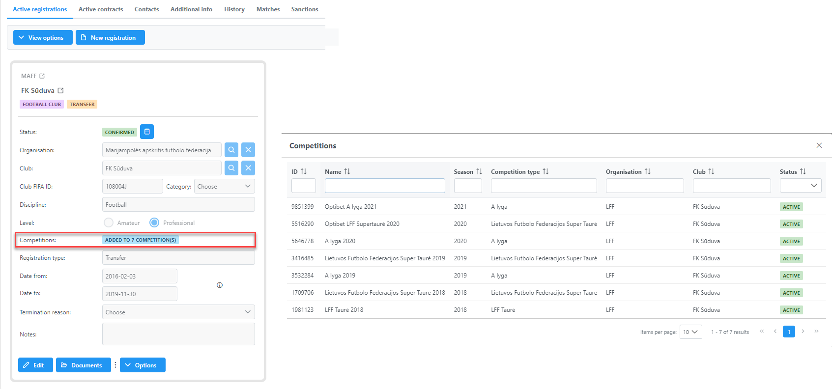 In addition, many organizations require that a person must be explicitly added (i.e., allocated, appointed, registered, signed up) to each competition. For example, each Club must prepare and submit a list of players, coaches, and staff that will be participating in a specific competition (e.g., "Competition catalog" or "Lista de buena fe"). Similarly, essential tournaments require a commitment and confirmation from their referees, assessors, and other match officials. Both examples imply that users must define (add) a relationship between a person’s registration and a competition.