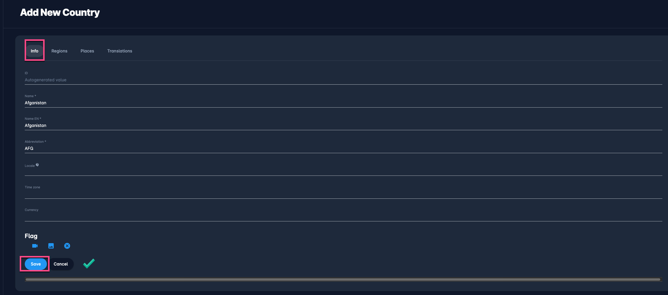 Flag (you can upload or take the flag image; please, note that the Save button should be clicked for the uploaded flag to be saved to a country)