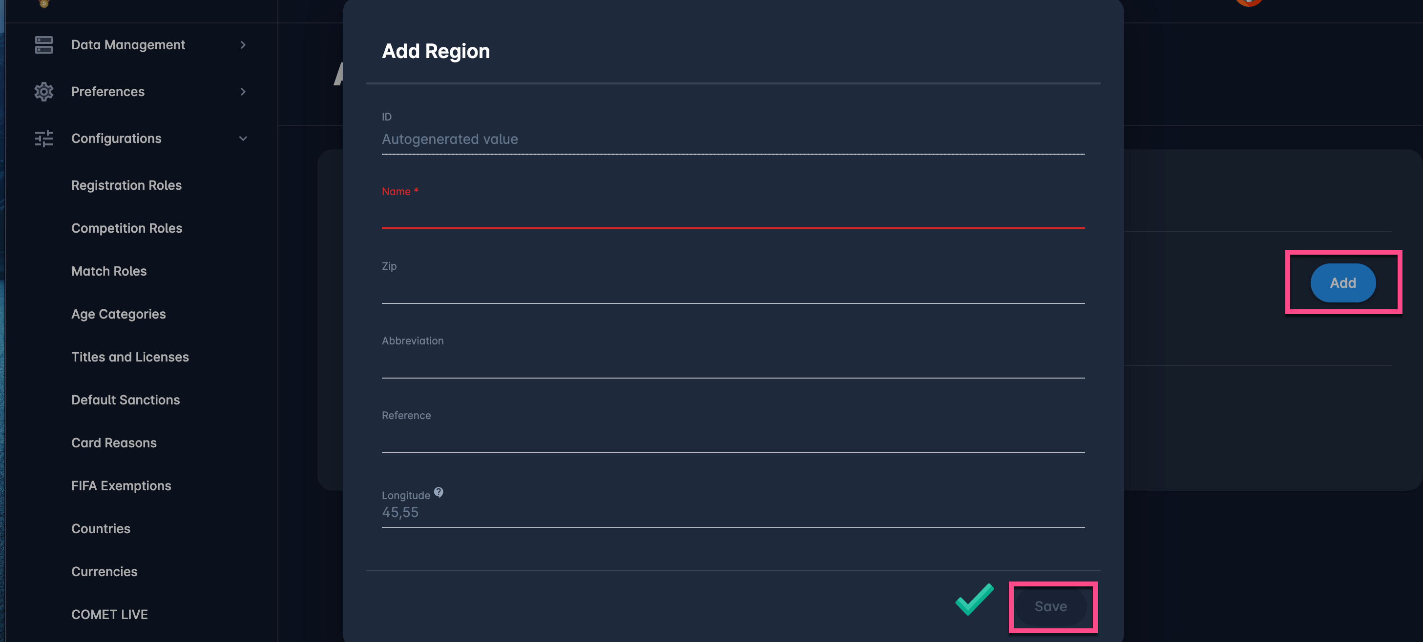 After successfully creating a new country you can access the regions tab. The regions can be managed for the existing countries as well.