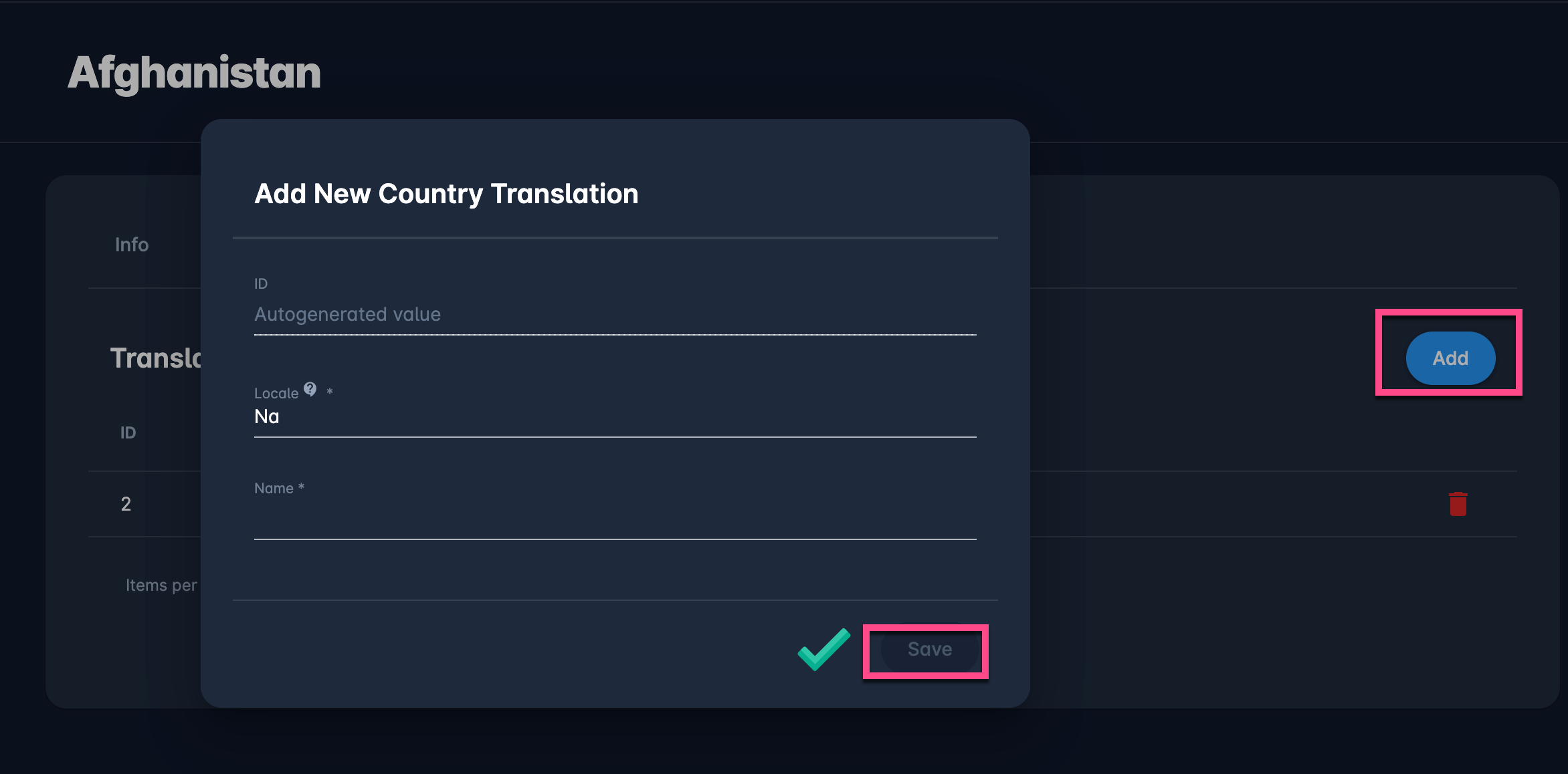 After successfully creating a new country, you can access the translation tab. Translations can be managed for the existing countries as well. The translations tab allows the country's name to be translated into the desired language.